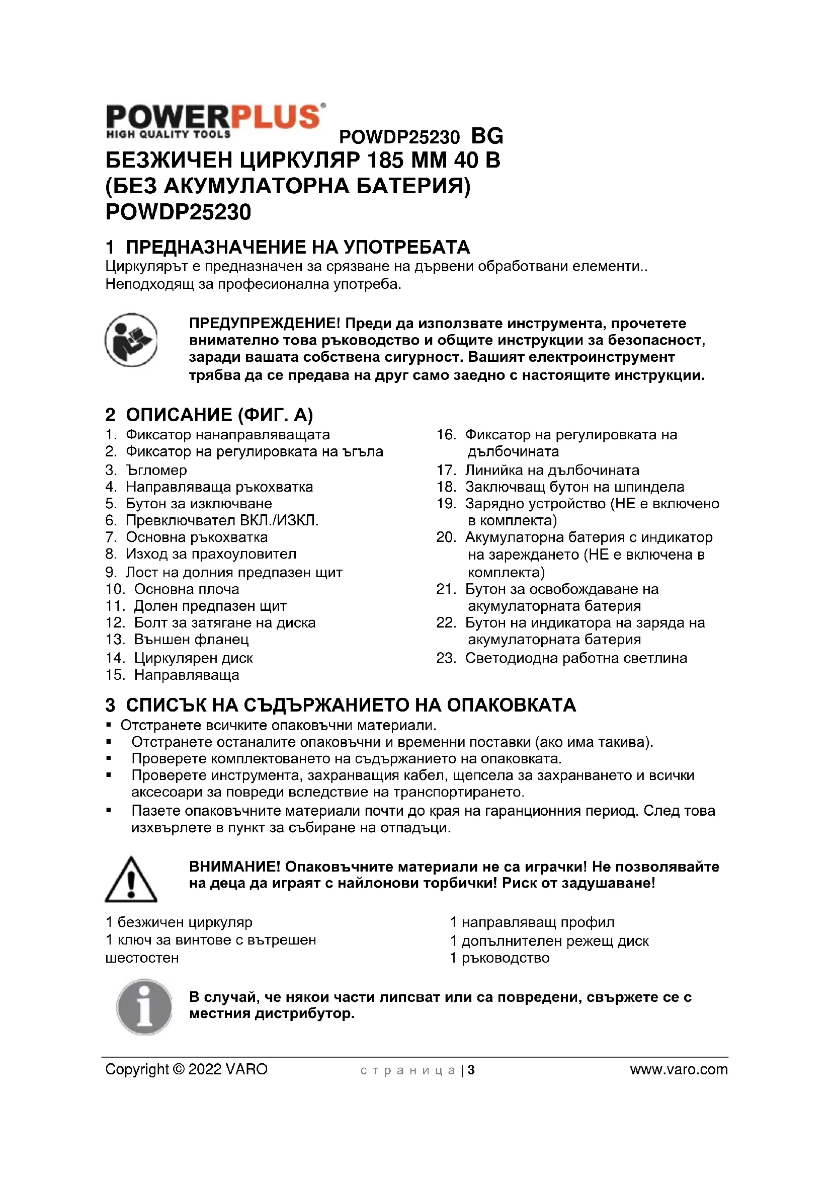 - Преди да пристъпите към поддръжка на инструмента, изключете го от щепсела.POWDP25230 BG Copyright © 2022 VARO с т р а н и ц а | 7 www.varo.com