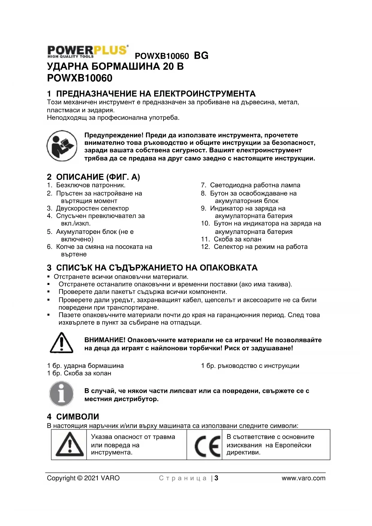 В съответствие с основните изисквания на Европейски директиви.POWXB10060 BG Copyright © 2021 VARO С т р а н и ц а | 4 www.varo.com