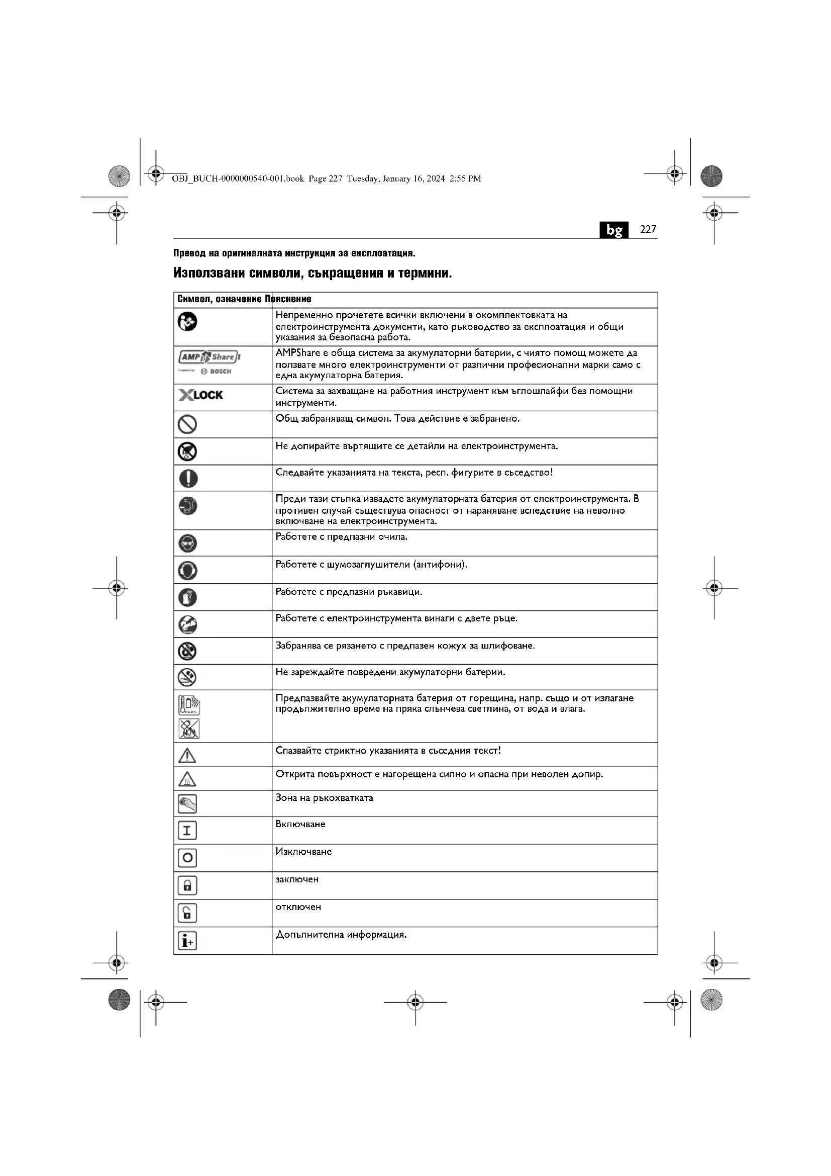 Превод на оригиналната инструкция за експлоатация. Използвани символи, съкращения и термини. Символ, означение Пояснение Непременно прочетете всички включени в окомплектовката на електроинструмента документи, като ръководство за експлоатация и общи указания за безопасна работа. AMPShare е обща система за акумулаторни батерии, с чиято помощ можете да ползвате много електроинструменти от различни професионални марки само с една акумулаторна батерия. Система за захващане на работния инструмент към ъглошлайфи без помощни инструменти. Общ забраняващ символ. Това действие е забранено. Не допирайте въртящите се детайли на електроинструмента. Следвайте указанията на текста, респ. фигурите в съседство! Преди тази стъпка извадете акумулаторната батерия от електроинструмента. В противен случай съществува опасност от нараняване вследствие на неволно включване на електроинструмента. Работете с предпазни очила. Работете с шумозаглушители (антифони). Работете с предпазни ръкавици. Работете с електроинструмента винаги с двете ръце. Забранява се рязането с предпазен кожух за шлифоване. Не зареждайте повредени акумулаторни батерии. Предпазвайте акумулаторната батерия от горещина, напр. също и от излагане продължително време на пряка слънчева светлина, от вода и влага. Спазвайте стриктно указанията в съседния текст! Открита повъ рхност е нагорещена силно и опасна при неволен допир. Зона на ръкохватката