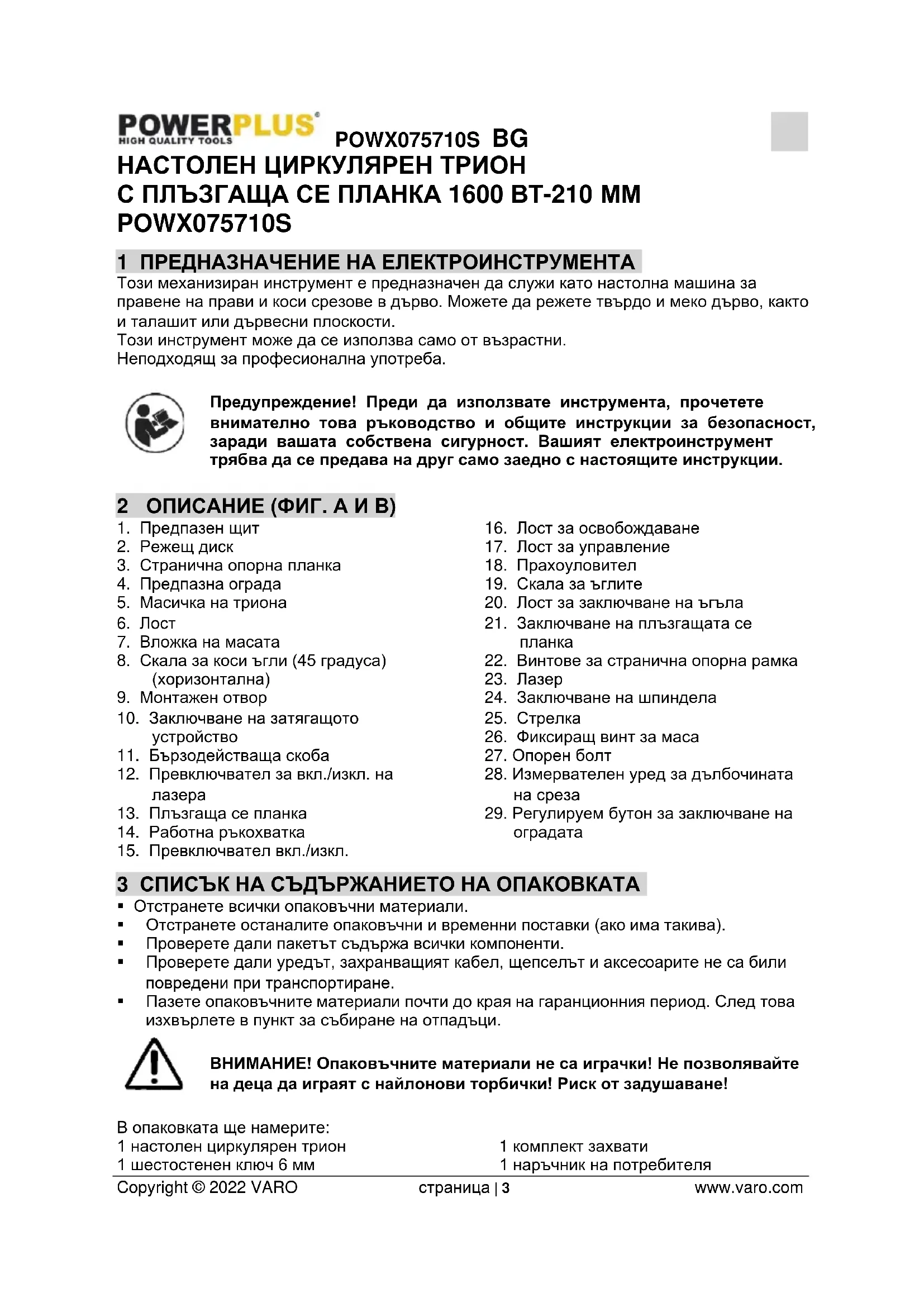 Copyright © 2022 VARO страница | 3 www.varo.com НАСТОЛЕН ЦИРКУЛЯРЕН ТРИОН С ПЛЪЗГАЩА СЕ ПЛАНКА 1600 ВТ-210 ММ POWX075710S 1 ПРЕДНАЗНАЧЕНИЕ НА ЕЛЕКТРОИНСТРУМЕНТА Този механизиран инструмент е предназначен да служи като настолна машина за правене на прави и коси срезове в дърво. Можете да режете твърдо и меко дърво, както и талашит или дървесни плоскости. Този инструмент може да се използва само от възрастни. Неподходящ за професионална употреба. Предупреждение! Преди да използвате инструмента, прочетете внимателно това ръководство и общите инструкции за безопасност, заради вашата собствена сигурност. Вашият електроинструмент трябва да се предава на друг само заедно с настоящите инструкции. 2 ОПИСАНИЕ (ФИГ. A И B)