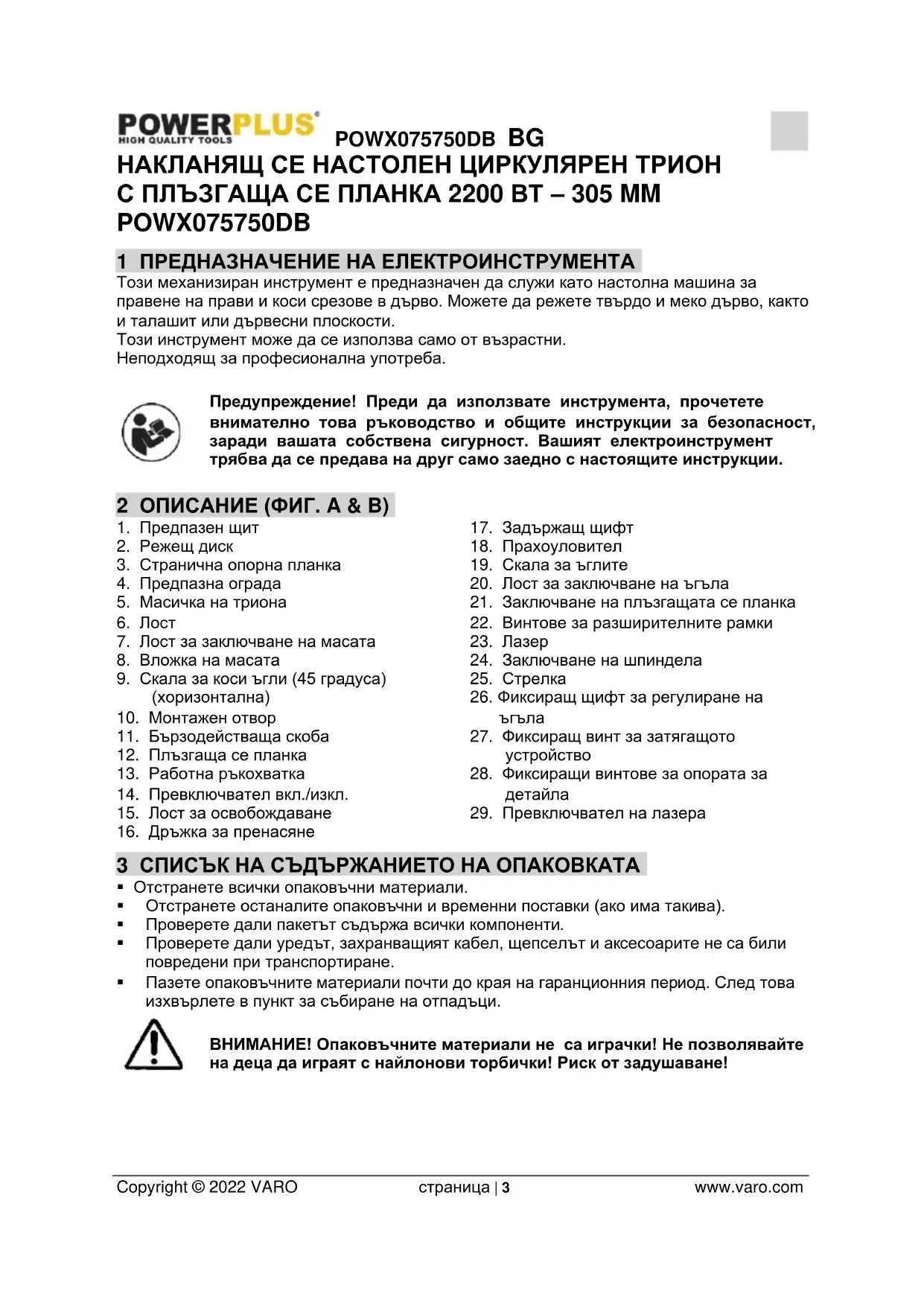 Copyright © 2022 VARO страница | 3 www.varo.com НАКЛАНЯЩ СЕ НАСТОЛЕН ЦИРКУЛЯРЕН ТРИОН С ПЛЪЗГАЩА СЕ ПЛАНКА 2200 ВТ – 305 MM POWX075750DB 1 ПРЕДНАЗНАЧЕНИЕ НА ЕЛЕКТРОИНСТРУМЕНТА Този механизиран инструмент е предназначен да служи като настолна машина за правене на прави и коси срезове в дърво. Можете да режете твърдо и меко дърво, както и талашит или дървесни плоскости. Този инструмент може да се използва само от възрастни. Неподходящ за професионална употреба. Предупреждение! Преди да използвате инструмента, прочетете внимателно това ръководство и общите инструкции за безопасност, заради вашата собствена сигурност. Вашият електроинструмент трябва да се предава на друг само заедно с настоящите инструкции. 2 ОПИСАНИЕ (ФИГ. A & B)