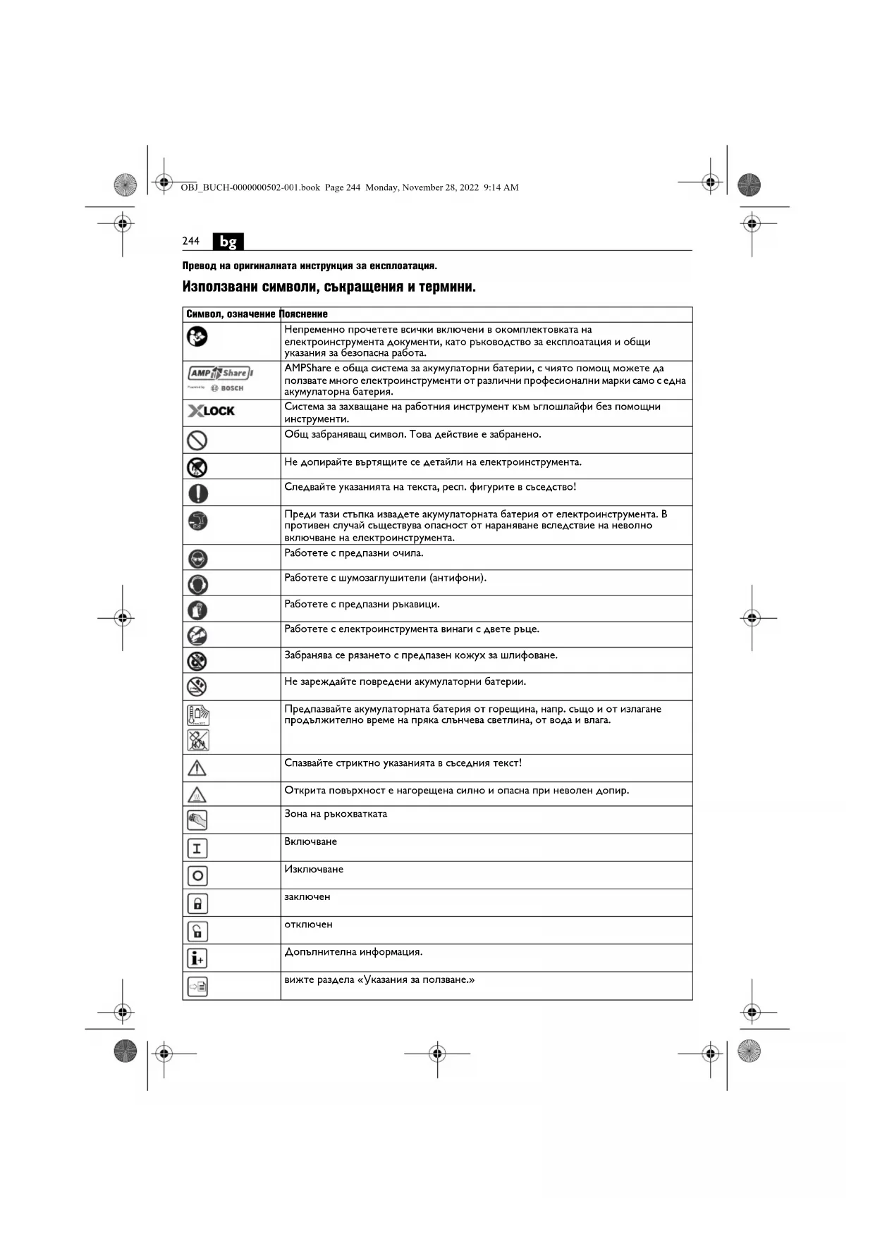 Превод на оригиналната инструкция за експлоатация. Използвани символи, съкращения и термини. Символ, означение Пояснение Непременно прочетете всички включени в окомплектовката на електроинструмента документи, като ръководство за експлоатация и общи указания за безопасна работа. AMPShare е обща система за акумулаторни батерии, с чиято помощ можете да ползвате много електроинструменти от различни професионални марки само с една акумулаторна батерия. Система за захващане на работния инструмент към ъглошлайфи без помощни инструменти. Общ забраняващ символ. Това действие е забранено. Не допирайте въртящите се детайли на електроинструмента. Следвайте указанията на текста, респ. фигурите в съседство! Преди тази стъпка извадете акумулаторната батерия от електроинструмента. В противен случай съществува опасност от нараняване вследствие на неволно включване на електроинструмента. Работете с предпазни очила. Работете с шумозаглушители (антифони). Работете с предпазни ръкавици. Работете с електроинструмента винаги с двете ръце. Забранява се рязането с предпазен кожух за шлифоване. Не зареждайте повредени акумулаторни батерии. Предпазвайте акумулаторната батерия от горещина, напр. също и от излагане продължително време на пряка слънчева светлина, от вода и влага. Спазвайте стриктно указанията в съседния текст! Открита повърхност е нагорещена силно и опасна при неволен допир. Зона на ръкохватката