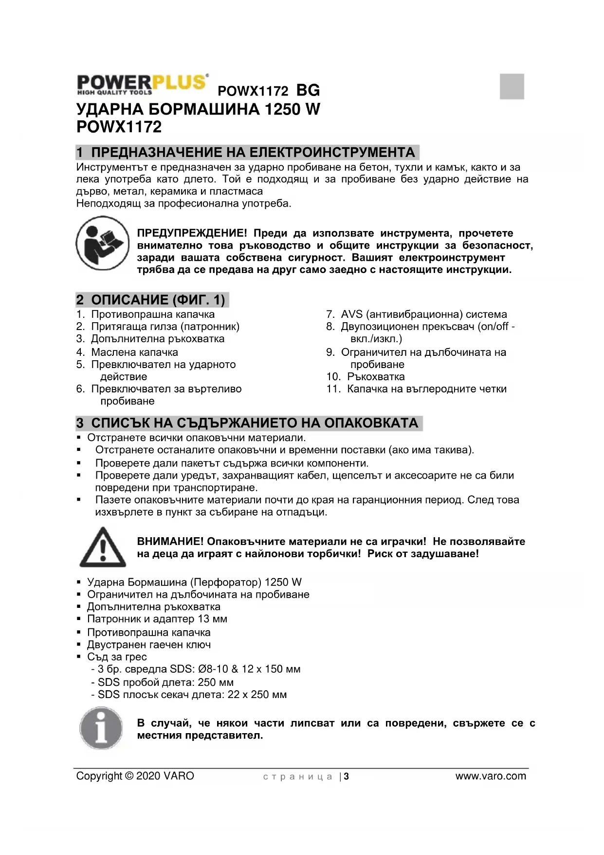 Съхранявайте фактурата за покупката като доказателство за датата, на която е направена тя. Трябва да върнете недемонтирания инструмент на продавача в приемливо чисто състояние, в оригиналното му лято куфарче, ако устройството има такова, придружавано от доказателството за покупката. 16 ОКОЛНА СРЕДА За случаите когато машината се нуждае от смяна на части след продължителна употреба, същите да не се изхвърлят в кофите за битови отпадъци, а да се изхвърлят по екологично съобразен начин. Електротехническите продукти за брак да не се изхвърлят заедно в кофите за домакински отпадъци. Същите да се рециклират, ако има съоръжения за това. За повече подробности по препоръките за рециклиране да се направи запитване до местните власти или до.POWX1172 BG Copyright © 2020 VARO с т р а н и ц а | 12 www.varo.com 17 ДЕКЛАРАЦИЯ ЗА СЪОТВЕТСТВИЕ VARO N.V. – Joseph Van Instraat 9 – BE2500 Lier – Белгия декларират, че Продукт: ударна бормашина Марка: POWERplus Mодел: POWX1172 е в съответствие с основните изисквания и други съответни разпоредби на приложимите Европейски директиви, базирани върху прилагането на Европейските хармонизирани стандарти. Всяка неупълномощена модификация на апарата анулира тази декларация. Европейски директиви (включително техните промени към датата на подписване, ако са приложими): 2011/65/EU 2006/42/EO 2014/30/EU Европейски хармонизирани стандарти (включително техните промени към датата на подписване, ако са приложими): EN60745-1 : 2009 EN60745-2-6 : 2010 EN55014-1 : 2017 EN55014-2 : 2015 EN61000-3-2 : 2014 EN61000-3-11 : 2000 Съхранител на техническата документация: Филип Ванкеркхов, VARO – Vic. Van Rompuy N.V. Долуподписаният действа от името на Изпълнителния директор на компанията, Philippe Vankerkhove Регулационни въпроси – мениджър по съответствията Lier, 31/03/2020WWW.VARO.COM