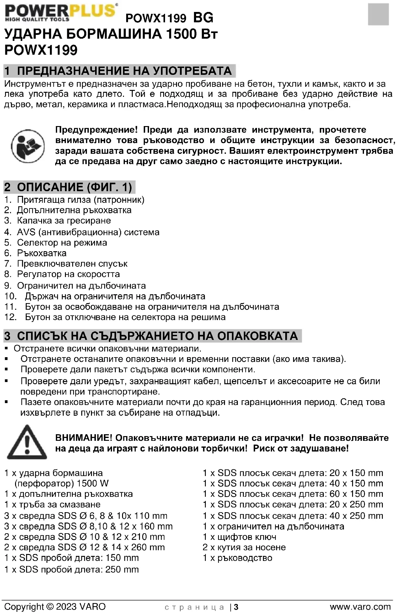 - Защитете очите си и другите работници от летящи частици и стружки. Носете каска! Поставете преграда между себе си и околните.POWX1199 BG Copyright © 2023 VARO с т р а н и ц а | 7 www.varo.com