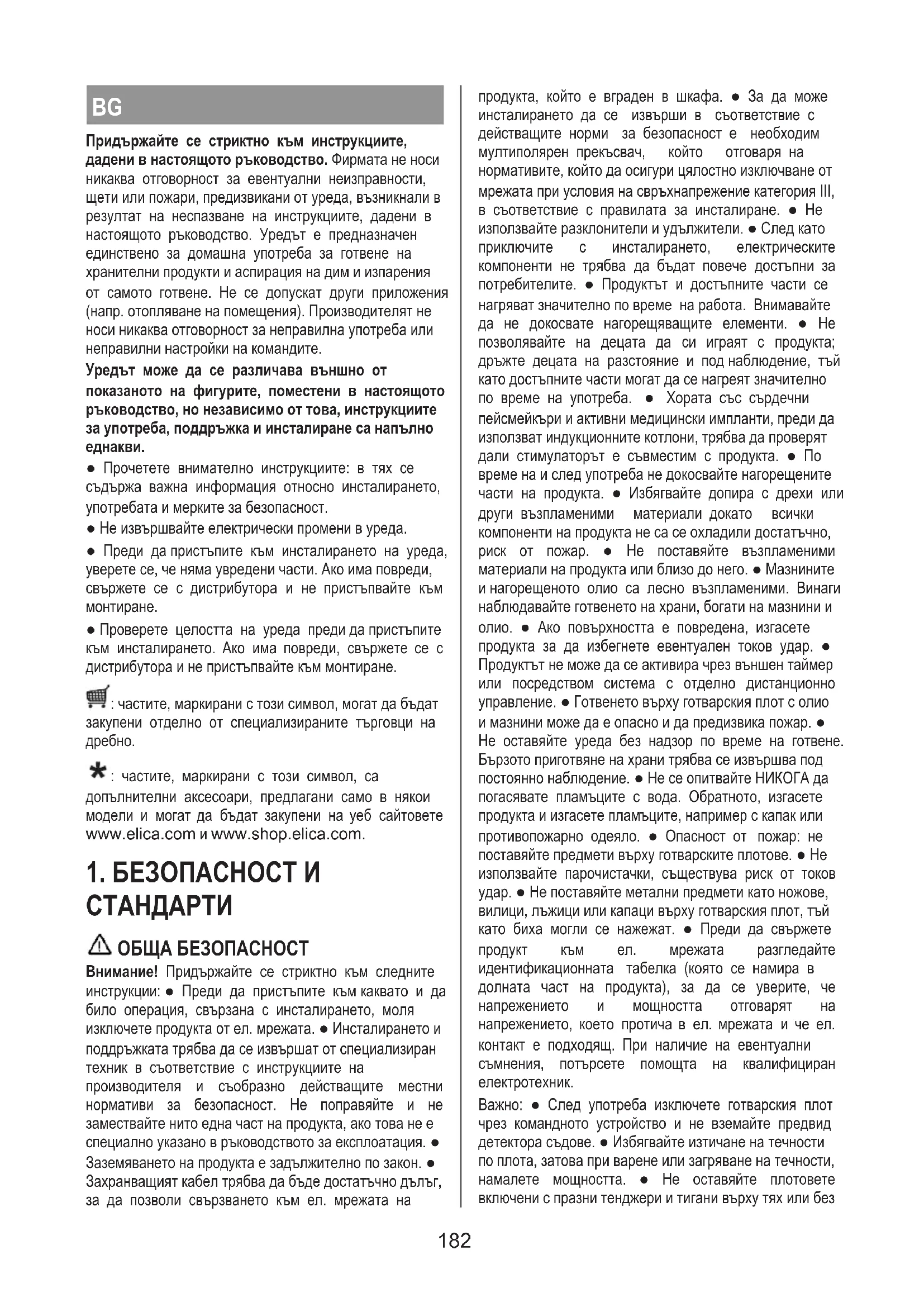 ОБЩА БЕЗОПАСНОСТ Внимание! Придържайте се стриктно към следните инструкции: ● Преди да пристъпите към каквато и да било операция, свързана с инсталирането, моля изключете продукта от ел. мрежата. ● Инсталирането и поддръжката трябва да се извършат от специализиран техник в съответствие с инструкциите на производителя и съобразно действащите местни нормативи за безопасност. Не поправяйте и не замествайте нито една част на продукта, ако това не е специално указано в ръководството за експлоатация. ● Заземяването на продукта е задължително по закон. ● Захранващият кабел трябва да бъде достатъчно дълъг, за да позволи свързването към ел. мрежата на продукта, който е вграден в шкафа. ● За да може инсталирането да се извърши в съответствие с действащите норми за безопасност е необходим мултиполярен прекъсвач, който отговаря на нормативите, който да осигури цялостно изключване от мрежата при условия на свръхнапрежение категория III, в съответствие с правилата за инсталиране. ● Не използвайте разклонители и удължители. ● След като приключите с инсталирането, електрическите компоненти не трябва да бъдат повече достъпни за потребителите. ● Продуктът и достъпните части се нагряват значително по време на работа. Внимавайте да не докосвате нагорещяващите елементи. ● Не позволявайте на децата да си играят с продукта; дръжте децата на разстояние и под наблюдение, тъй като достъпните части могат да се нагреят значително по време на употреба. ● Хората със сърдечни пейсмейкъри и активни медицински импланти, преди да използват индукционните котлони, трябва да проверят дали стимулаторът е съвместим с продукта. ● По време на и след употреба не докосвайте нагорещените части на продукта. ● Избягвайте допира с дрехи или други възпламеними материали докато всички компоненти на продукта не са се охладили достатъчно, риск от пожар. ● Не поставяйте възпламеними материали на продукта или близо до него. ● Мазнините и нагорещеното олио са лесно възпламеними. Винаги наблюдавайте готвенето на храни, богати на мазнини и олио. ● Ако повърхността е повредена, изгасете продукта за да избегнете евентуален токов удар. ● Продуктът не може да се активира чрез външен таймер или посредством система с отделно дистанционно управление. ● Готвенето върху готварския плот с олио и мазнини може да е опасно и да предизвика пожар. ● Не оставяйте уреда без надзор по време на готвене. Бързото приготвяне на храни трябва се извършва под постоянно наблюдение. ● Не се опитвайте НИКОГА да погасявате пламъците с вода. Обратното, изгасете продукта и изгасете пламъците, например с капак или противопожарно одеяло. ● Опасност от пожар: не поставяйте предмети върху готварските плотове. ● Не използвайте парочистачки, съществува риск от токов удар. ● Не поставяйте метални предмети като ножове, вилици, лъжици или капаци върху готварския плот, тъй като биха могли се нажежат. ● Преди да свържете продукт към ел. мрежата разгледайте идентификационната табелка (която се намира в долната част на продукта), за да се уверите, че напрежението и мощността отговарят на напрежението, което протича в ел. мрежата и че ел. контакт е подходящ. При наличие на евентуални съмнения, потърсете помощта на квалифициран електротехник. Важно: ● След употреба изключете готварския плот чрез командното у