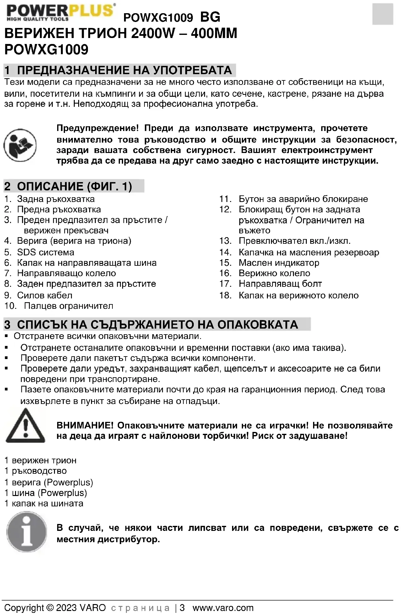 - 19 ДЕКЛАРАЦИЯ ЗА СЪОТВЕТСТВИЕ POWXG1009 BG Copyright © 2023 VARO с т р а н и ц а | 3 www.varo.com ВЕРИЖЕН ТРИОН 2400W – 400MM POWXG1009 1 ПРЕДНАЗНАЧЕНИЕ НА УПОТРЕБАТА Тези модели са предназначени за не много често използване от собственици на къщи, вили, посетители на къмпинги и за общи цели, като сечене, кастрене, рязане на дърва за горене и т.н. Неподходящ за професионална употреба. Предупреждение! Преди да използвате инструмента, прочетете внимателно това ръководство и общите инструкции за безопасност, заради вашата собствена сигурност. Вашият електроинструмент трябва да се предава на друг само заедно с настоящите инструкции. 2 ОПИСАНИЕ (ФИГ. 1) p. 16
