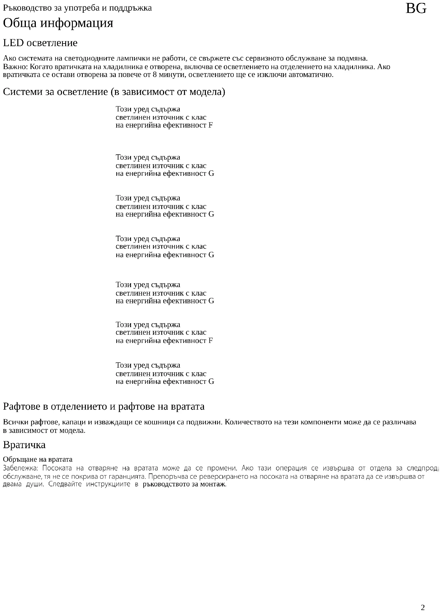 Обща информация LED осветление Ако системата на светодиодните лампички не работи, се свържете със сервизното обслужване за подмяна. Важно: Когато вратичката на хладилника е отворена, включва се осветлението на отделението на хладилника. Ако вратичката се остави отворена за повече от 8 минути, осветлението ще се изключи автоматично. Системи за осветление (в зависимост от модела) Този уред съдържа светлинен източник с клас на енергийна ефективност F Този уред съдържа светлинен източник с клас на енергийна ефективност G Този уред съдържа светлинен източник с клас на енергийна ефективност G Този уред съдържа светлинен източник с клас на енергийна ефективност G Този уред съдържа светлинен източник с клас на енергийна ефективност G Този уред съдържа светлинен източник с клас на енергийна ефективност F Този уред съдържа светлинен източник с клас на енергийна ефективност G Рафтове в отделението и рафтове на вратата Всички рафтове, капаци и изваждащи се кошници са подвижни. Количеството на тези компоненти може да се различава в зависимост от модела.