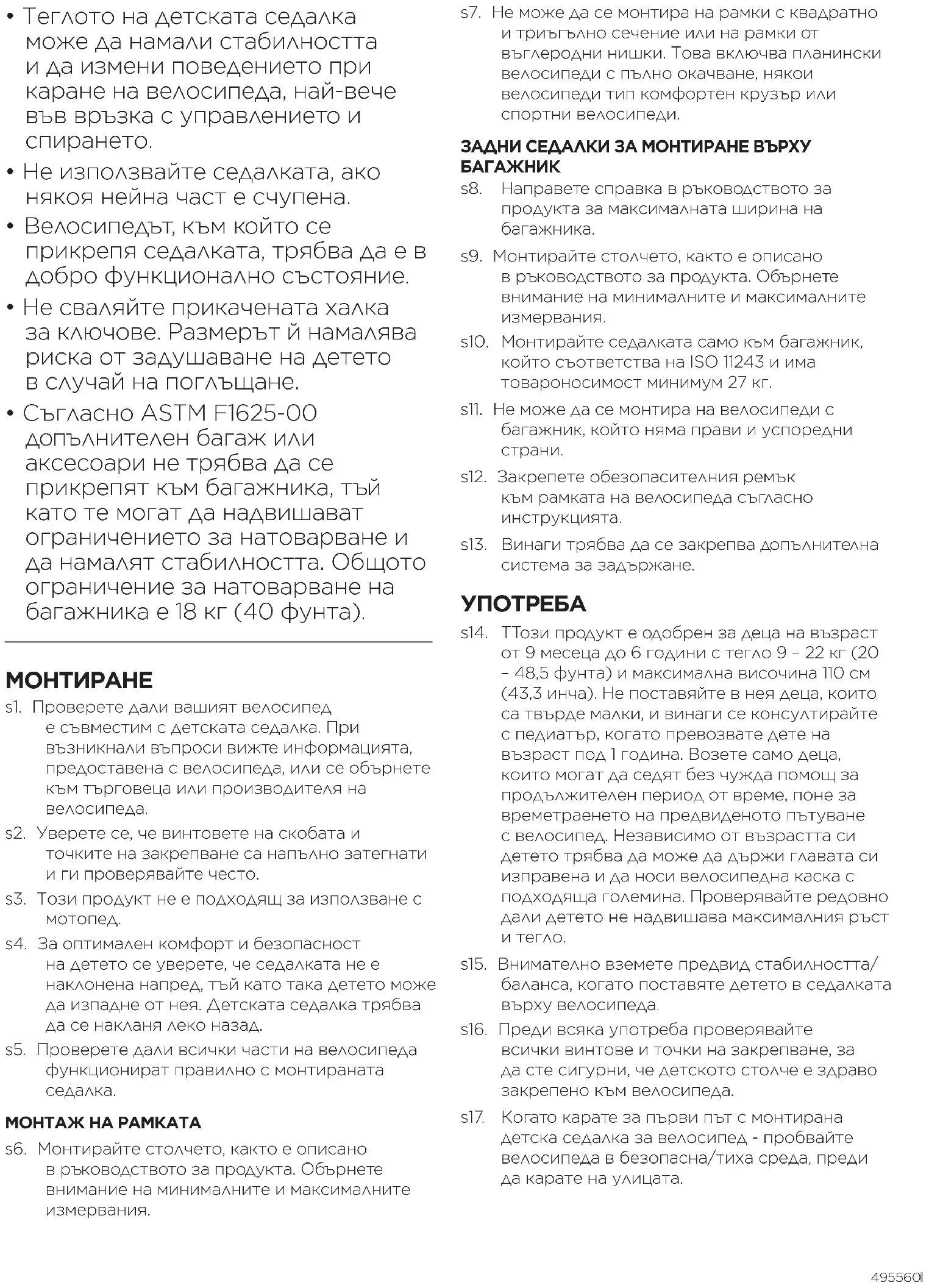 s15. Внимателно вземете предвид стабилността/ баланса, когато поставяте детето в седалката върху велосипеда. s16. Преди всяка употреба проверявайте всички винтове и точки на закрепване, за да сте сигурни, че детското столче е здраво закрепено към велосипеда. s17. Когато карате за първи път с монтирана детска седалка за велосипед - пробвайте велосипеда в безопасна/тиха среда, преди да карате на улицата.50 5560140001 s18. По време на карането на велосипеда се уверете, че вие идетето ви носите съвместими с EN 1078 каски за велосипед. s19. Редовно обръщайте внимание на детето си по време на пътуването. s20. Никога не оставяйте детето безнадзор в