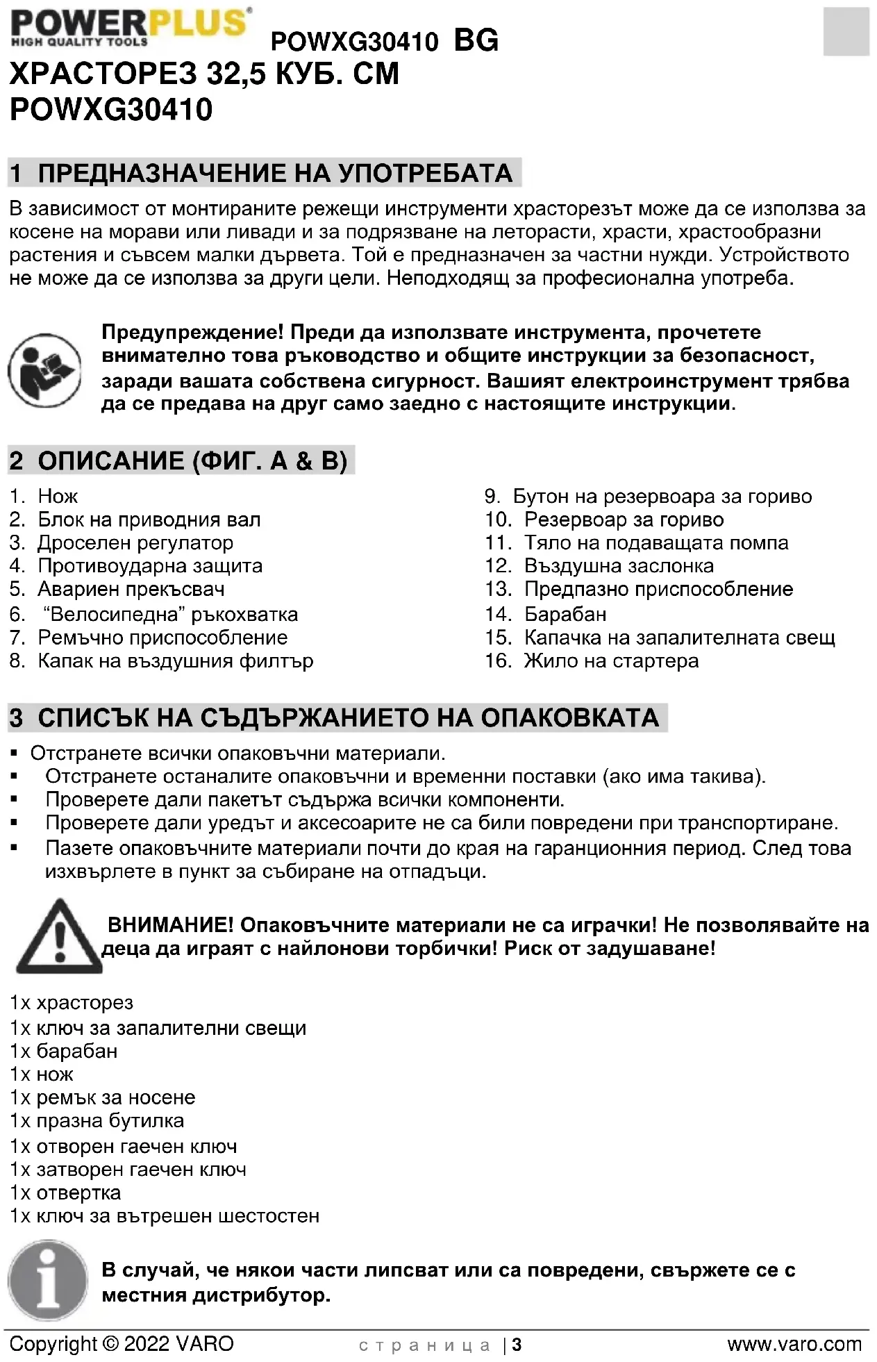 - 19 ДЕКЛАРАЦИЯ ЗА СЪОТВЕТСТВИЕ POWXG30410 BG Copyright © 2022 VARO с т р а н и ц а | 3 www.varo.com ХРАСТОРЕЗ 32,5 КУБ. СМ POWXG30410 1 ПРЕДНАЗНАЧЕНИЕ НА УПОТРЕБАТА В зависимост от монтираните режещи инструменти храсторезът може да се използва за косене на морави или ливади и за подрязване на леторасти, храсти, храстообразни растения и съвсем малки дървета. Той е предназначен за частни нужди. Устройството не може да се използва за други цели. Неподходящ за професионална употреба. Предупреждение! Преди да използвате инструмента, прочетете внимателно това ръководство и общите инструкции за безопасност, заради вашата собствена сигурност. Вашият електроинструмент трябва да се предава на друг само заедно с настоящите инструкции. 2 ОПИСАНИЕ (ФИГ. A & B) p. 19