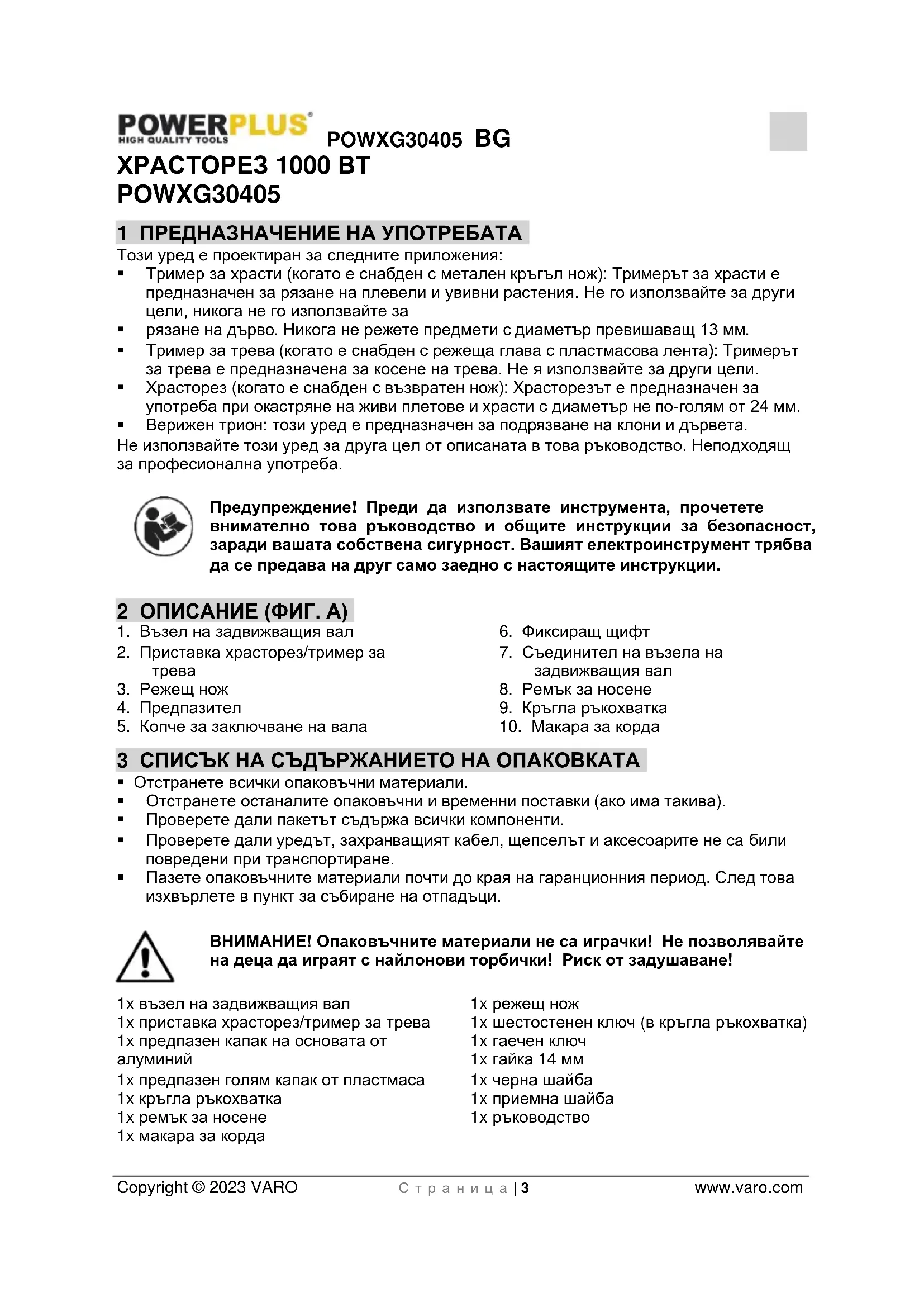 - 16 ДЕКЛАРАЦИЯ ЗА СЪОТВЕТСТВИЕ POWXG30405 BG Copyright © 2023 VARO С т р а н и ц а | 3 www.varo.com ХРАСТОРЕЗ 1000 ВТ POWXG30405 1 ПРЕДНАЗНАЧЕНИЕ НА УПОТРЕБАТА Този уред е проектиран за следните приложения: p. 16