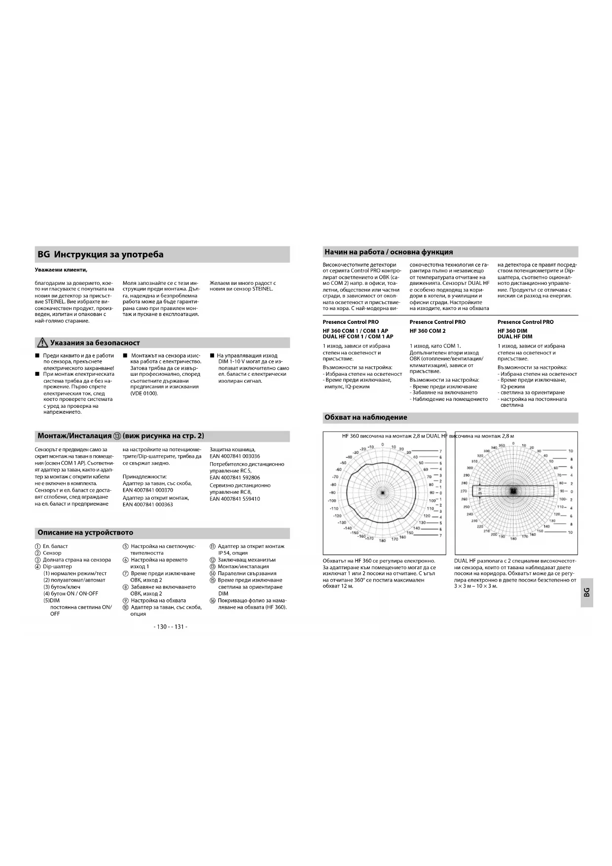 k Адаптер за открит монтаж IP 54, опция l Заключващ механизъм m Монтаж/инсталация n Паралелни свързвания o Време преди изключване светлина за ориентиране DIM p Покриващо фолио за нама- ляване на обхвата (HF 360). Монтаж/Инсталация m (виж рисунка на стр. 2) Сензорът е предвиден само за скрит монтаж на таван в помеще- ния (освен COM 1 AP). Съответни- ят адаптер за таван, както и адап- тер за монтаж с открити кабели не е включен в комплекта. Сензорът и ел. баласт се доста- вят сглобени, след вграждане на ел. баласт и предприемане на настройките на потенциоме- трите/Dip-шалтерите, трябва да се свържат заедно. Принадлежности: Адаптер за таван, със скоба, EAN 4007841 000370 Адаптер за открит монтаж, EAN 4007841 000363 Защитна кошница, EAN 4007841 003036 Потребителско дистанционно управление RC 5, EAN 4007841 592806 Сервизно дистанционно управление RC 8, EAN 4007841 559410 BG Инструкция за употреба Уважаеми клиенти, благодарим за доверието, кое- то ни гласувахте с покупката на новия ви детектор за присъст- вие STEINEL. Вие избрахте ви- сококачествен продукт, произ- веден, изпитан и опакован с най-голямо старание. Моля запознайте се с тези ин- струкции преди монтажа. Дъл- га, надеждна и безпроблемна работа може да бъде гаранти- рана само при правилен мон- таж и пускане в експлоатация. Желаем ви много радост с новия ви сензор STEINEL. Указания за безопасност BG- 132 - - 133 - Технически данниЕл. инсталация/автоматичен режим При избор на кабелите трябва да се спазват предписанията на VDE 0100 (виж сведенията за безопас- ност на стр. 9). За кабелите на детектора е в сила : според VDE 0100 520 раздел 6 кабелът между сензора и ел. баласт може да бъ- де с много проводници, както за ел. захранване, така и за упра- вление (напр. NYM 5 × 1,52). Кабелната мрежа трябва да бъде с макс. диаметър от 10 мм. За клемата към захранването е предвидено пространство за макс. 2 × 1,5 мм