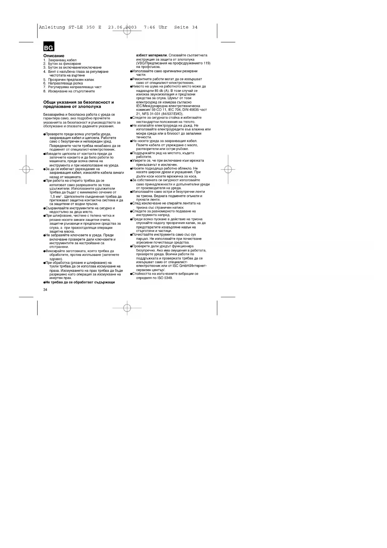 Уверете се, че при включване към мрежата прекъсвачът е изключен. Носете подходящо работно облекло. Не носете широки дрехи и украшения. При дълги коси носете мрежичка за коса. За собствената си сигурност използвайте само принадлежности и допълнителни уреди от производителя на уреда. Използвайте само остри и безупречни ленти за триона. Веднага подменете огънати и пукнати ленти. След изключване не спирайте лентата на триона със страничен натиск Следете за равномерното подаване на инструмента напред. Преди всяко пускане в действие на триона спускайте надолу прозрачния капак, за да предотвратите изхвърляне навън на стърготини и частици. Почиствайте инструмента само със сух парцал. Не използвайте при почистване агресивни почистващи средства. Проверете дали уредът функционира безупречно. Ако има смущения в работата, проверете уреда. Всички работи по поддръжката и проверката трябва да се извършват само от специалист- електротехник или от ISC GmbH/Интернет- сервизен център/. Стойността на излъчваните вибрации се определя по ISO 5349. Anleitung ST-LE 350 E 23.06.2003 7:46 Uhr Seite 3435
