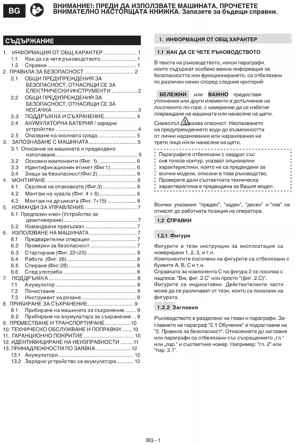 Ръководството е разделено на глави и параграфи. За- главието на параграф “2.1 Обучение” е подзаглавие на “2. Правила за безопасност”. Отнасянията до заглавия или параграфи са отбелязани със съкращението „гл.“ или „пар.“ и съответния номер. Например: “гл. 2” или “пар. 2.1”. ВНИМАНИЕ!: ПРЕДИ ДА ИЗПОЛЗВАТЕ МАШИНАТА, ПРОЧЕТЕТЕ ВНИМАТЕЛНО НАСТОЯЩАТА КНИЖКА. Запазете за бъдещи справки.