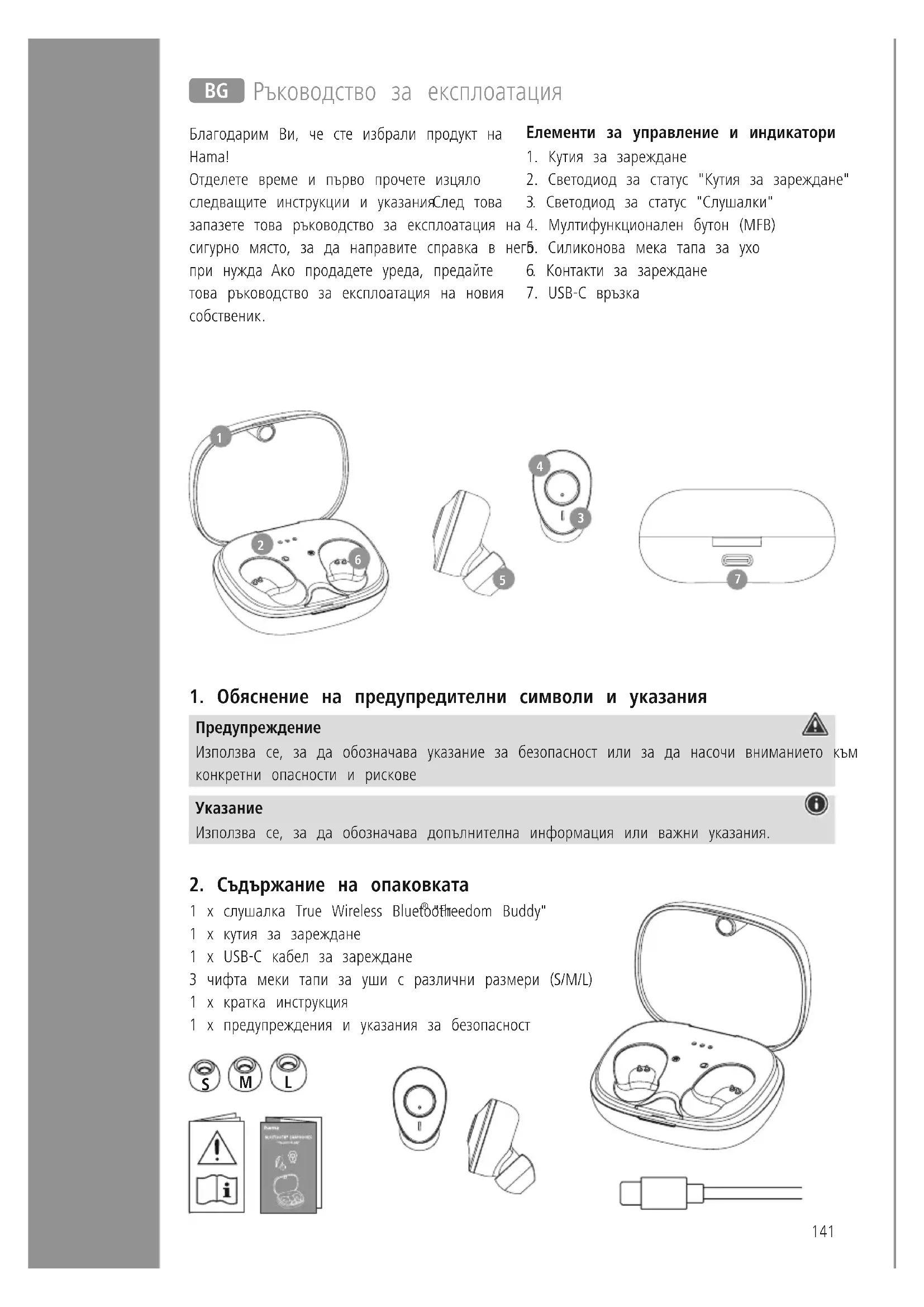 "Freedom Buddy" 1 x кутия за зареждане 1 x USB-C кабел за зареждане 3 чифта меки тапи за уши с различни размери (S/M/L) 1 x кратка инструкция 1 x предупреждения и указания за безопасност