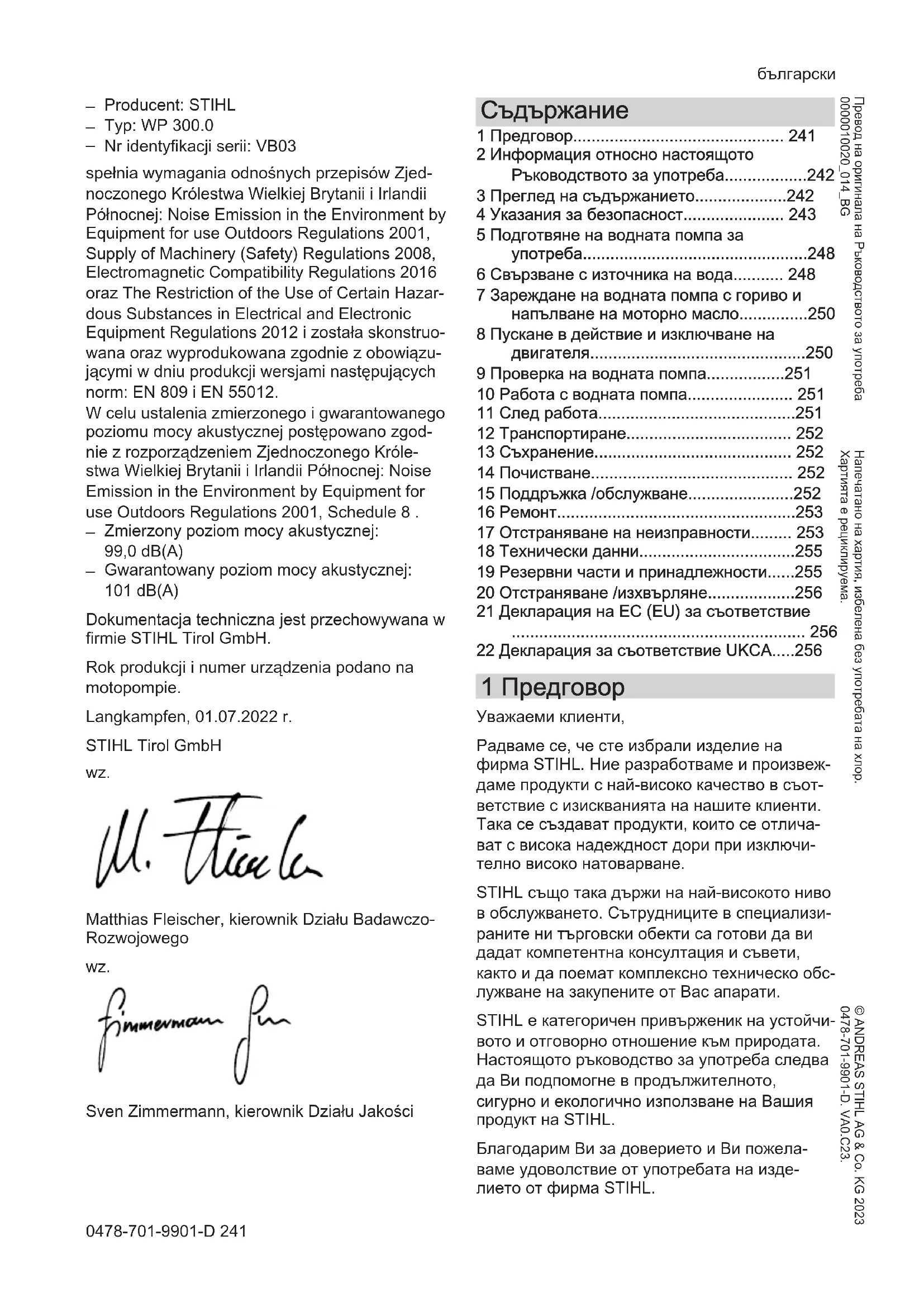 Гарантирано ниво на шума: 101 dB(A) Техническата документация се съхранява в STIHL Tirol GmbH. Годината на производство и машинният номер са посочени върху водната помпа. Langkampfen, 01.07.2022 г. STIHL Tirol GmbH