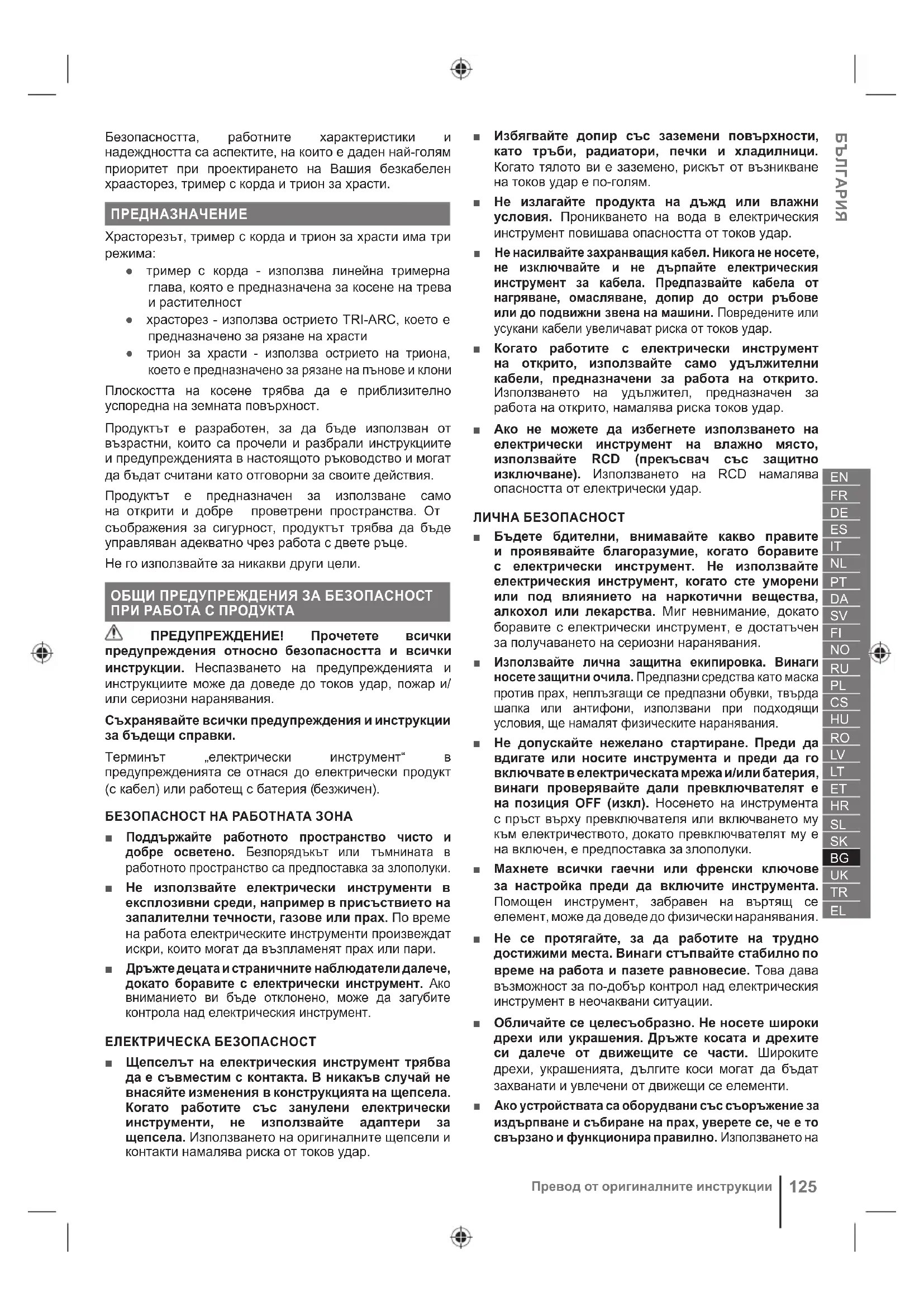 ● тример с корда - използва линейна тримерна глава, която е предназначена за косене на трева и растителност ● храсторез - използва острието TRI-ARC, което е предназначено за рязане на храсти ● трион за храсти - използва острието на триона, което е предназначено за рязане на пънове и клони Плоскостта на косене трябва да е приблизително успоредна на земната повърхност. Продуктът е разработен, за да бъде използван от възрастни, които са прочели и разбрали инструкциите и предупрежденията в настоящото ръководство и могат да бъдат считани като отговорни за своите действия. Продуктът е предназначен за използване само на открити и добре проветрени пространства. От съображения за сигурност, продуктът трябва да бъде управляван адекватно чрез работа с двете ръце. Не го използвайте за никакви други цели. ОБЩИ ПРЕДУПРЕЖДЕНИЯ ЗА БЕЗОПАСНОСТ ПРИ РАБОТА С ПРОДУКТА ПРЕДУПРЕЖДЕНИЕ! Прочетете всички предупреждения относно безопасността и всички инструкции. Неспазването на предупрежденията и инструкциите може да доведе до токов удар, пожар и/ или сериозни наранявания. Съхранявайте всички предупреждения и инструкции за бъдещи справки. Терминът „електрически инструмент“ в предупрежденията се отнася до електрически продукт (с кабел) или работещ с батерия (
