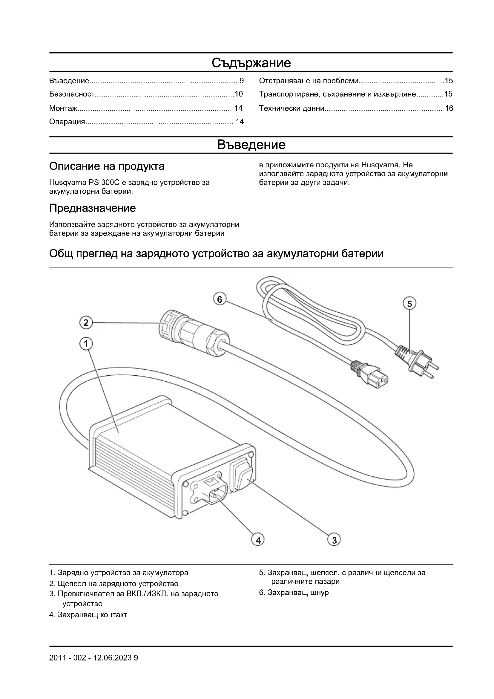 2011 - 002 - 12.06.2023батерии на Husqvarna със зарядното устройство за акумулаторни батерии. Ако имате въпроси, се обърнете към Вашия дилър на Husqvarna.
