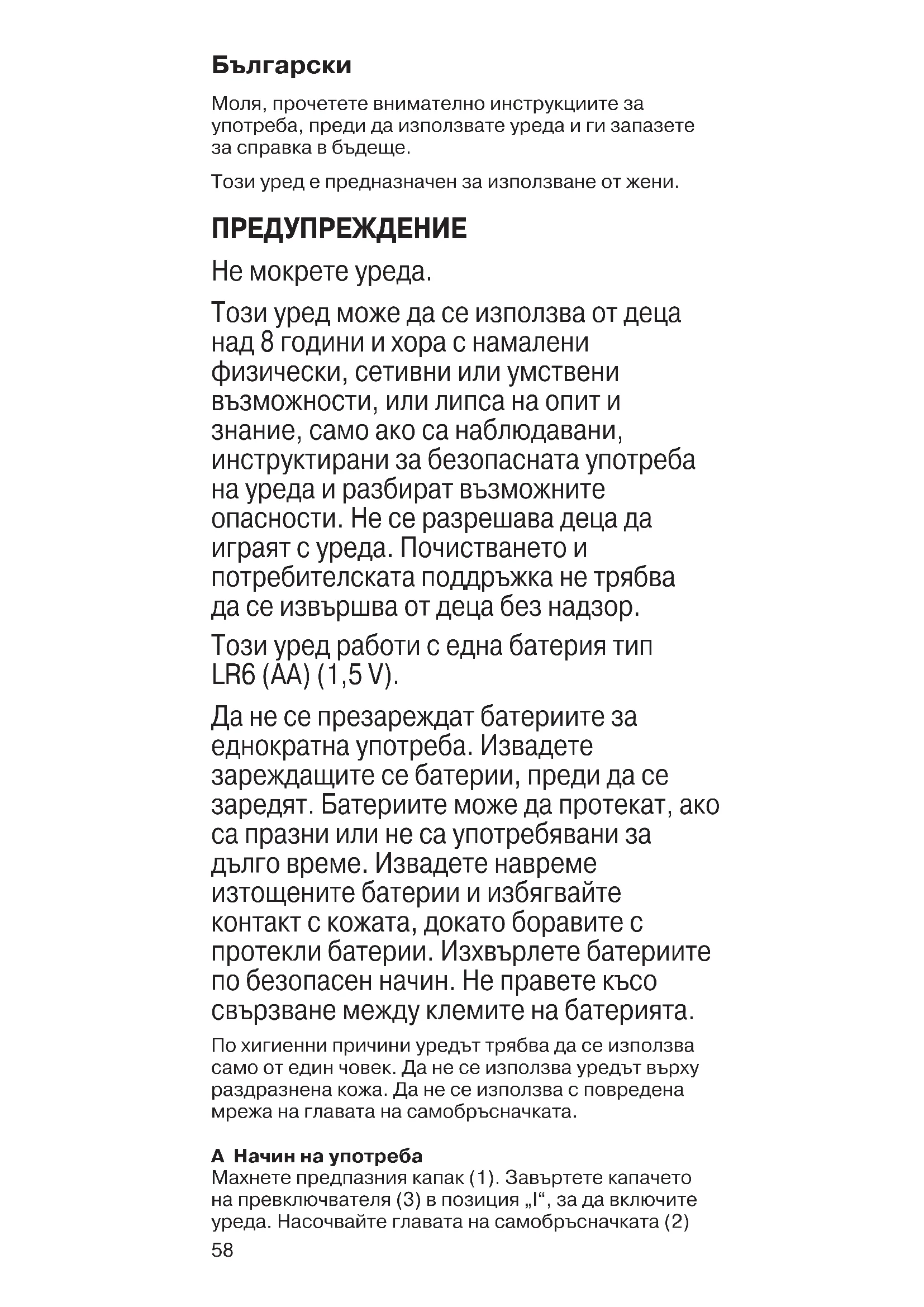 Моля, прочетете внимателно инструкциите за употреба, преди да използвате уреда и ги запазете за справка в бъдеще. Този уред е предназначен за използване от жени. ПРЕДУПРЕЖДЕНИЕ Не мокрете уреда. Този уред може да се използва от деца над 8 години и хора с намалени физически, сетивни или умствени възможности, или липса на опит и знание, само ако са наблюдавани, инструктирани за безопасната употреба на уреда и разбират възможните опасности. Не се разрешава деца да играят с уреда. Почистването и потребителската поддръжка не трябва да се извършва от деца без надзор. Този уред работи с една батерия тип LR6 (AA) (1,5V). Да не се презареждат батериите за еднократна употреба. Извадете зареждащите се батерии, преди да се заредят. Батериите може да протекат, ако са празни или не са употребявани за дълго време. Извадете навреме изтощените батерии и избягвайте контакт с кожата, докато боравите с протекли батерии. Изхвърлете батериите по безопасен начин. Не правете късо свързване между клемите на батерията. По хигиенни причини уредът трябва да се използва само от един човек. Да не се използва уредът върху раздразнена кожа. Да не се използва с повредена мрежа на главата на самобръсначката. А Начин на употреба Махнете предпазния капак (1). Завъртете капачето на превключвателя (3) в позиция „I“, за да включите уреда. Насочвайте главата на самобръсначката (2) 91090883_Face_Shaver_FS_1000_EURO.indd 5891090883_Face_Shaver_FS_1000_EURO.indd 58 19.02.20 13:0219.02.20 13:0259 хоризонтално и бавно върху кожата. В зависимост от предпочитанията си, използвайте кръгови или линейни