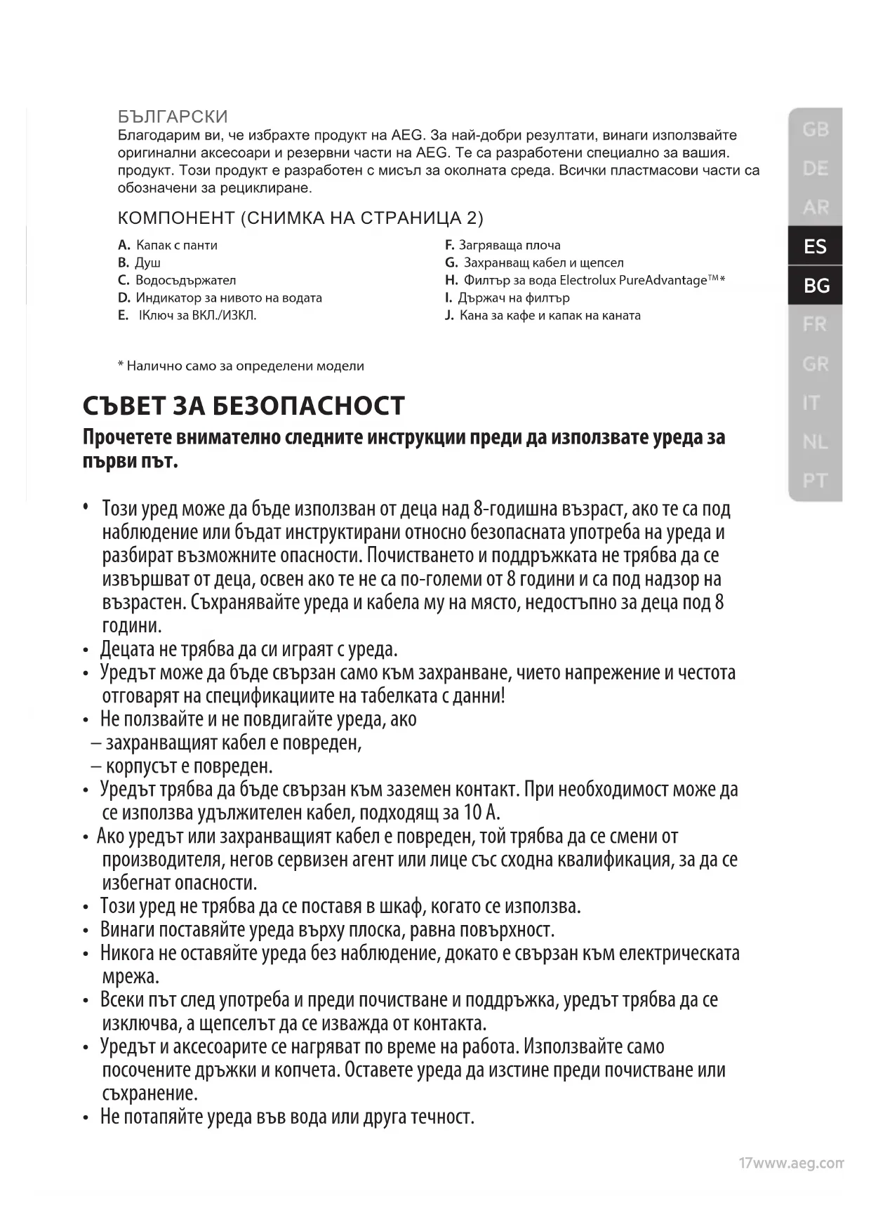 Благодарим ви, че избрахте продукт на AEG. За най-добри резултати, винаги използвайте оригинални аксесоари и резервни части на AEG. Те са разработени специално за вашия. продукт. Този продукт е разработен с мисъл за околната среда. Всички пластмасови части са обозначени за рециклиране. КОМПОНЕНТ )СНИМКА НА СТРАНИЦА 2( A. Капак с панти B. Душ C. Водосъдържател D. Индикатор за нивото на водата E. IКлюч за ВКЛ./ИЗКЛ. F. Загряваща плоча G. Захранващ кабел и щепсел H. Филтър за вода Electrolux PureAdvantage
