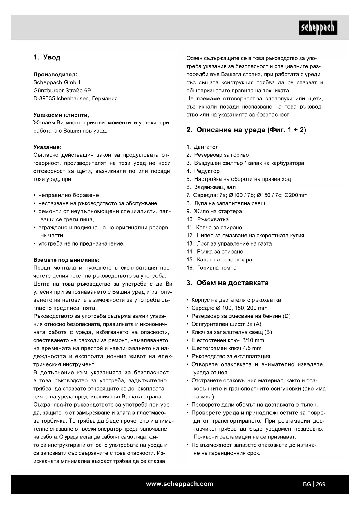 m Внимание! Преди пуска в експлоатация непременно мон- тирайте изцяло уреда! Преди пуск в експлоатация е важно да сте запоз- нати и да следвате указанията за безопасност. Винаги изключвайте двигателя, изключвайте на- крайника на щекер за запалване и носете пред- пазни ръкавици, когато работите по почвения свредел. Почвеният свредел може да бъде пуснат в експлоатация само след пълното му сглобяване и тестване. ВНИМАНИЕ! Прочетете внимателно указанията за безопасност (вижте “Указанията за безопасност” казания и допълнителни у за машини с бензинов двигател).www.scheppach.com
