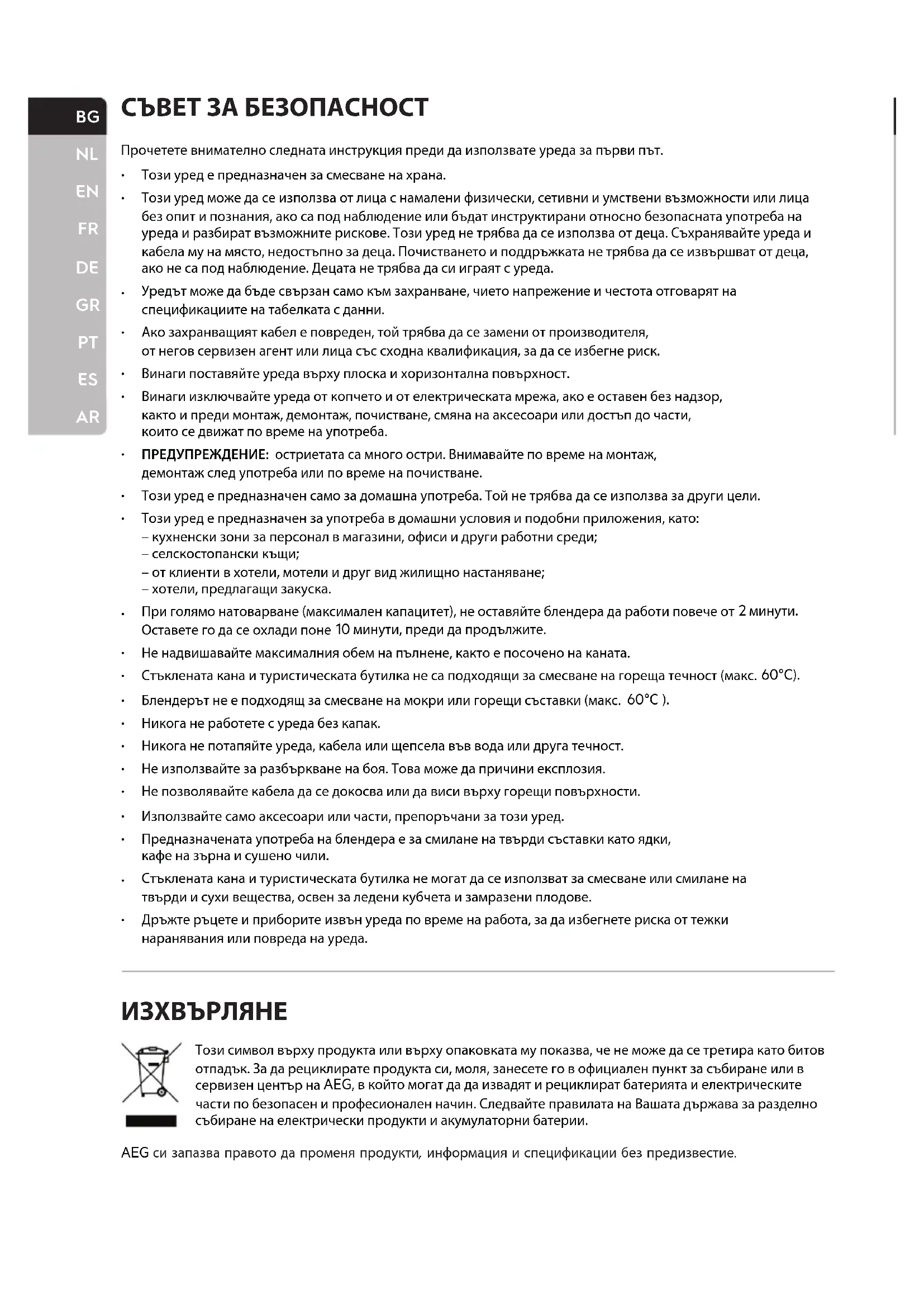 Този символ върху продукта или върху опаковката му показва, че не може да се третира като битов отпадък. За да рециклирате продукта си, моля, занесете го в официален пункт за събиране или в сервизен център на AEG, в който могат да да извадят и рециклират батерията и електрическите части по безопасен и професионален начин. Следвайте правилата на Вашата държава за разделно събиране на електрически продукти и акумулаторни батерии. AEG си запазва правото да променя продукти, информация и спецификации без предизвестие. Прочетете внимателно следната инструкция преди да използвате уреда за първи път.