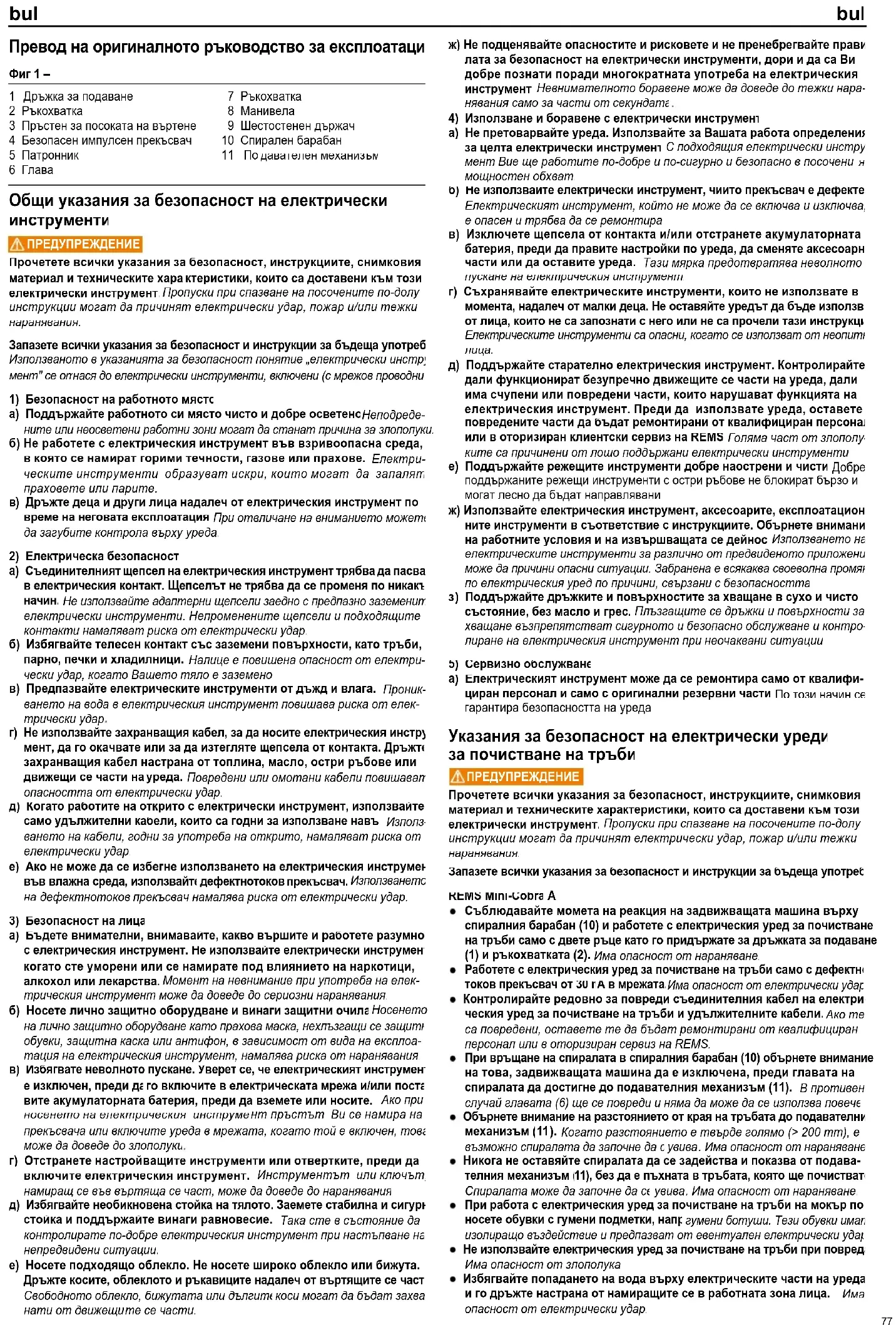 Прочетете всички указания за безопасност, инструкциите, снимковия материал и техническите характеристики, които са доставени към този електрически инструмент. Пропуски при спазване на посочените по-долу инструкции могат да причинят електрически удар, пожар и/или тежки наранявания. Запазете всички указания за безопасност и инструкции за бъдеща употреба. REMS Mini-Cobra