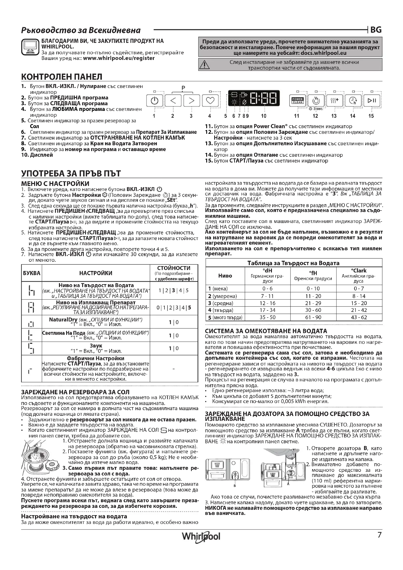 Преди да използвате уреда, прочетете внимателно указанията за безопасност и инсталиране. Повече информация за вашия продукт ще намерите на уебсайт: docs.whirlpool.eu След инсталиране не забравяйте да махнете всички транспортни части от съдомиялната. МЕНЮ С НАСТРОЙКИ