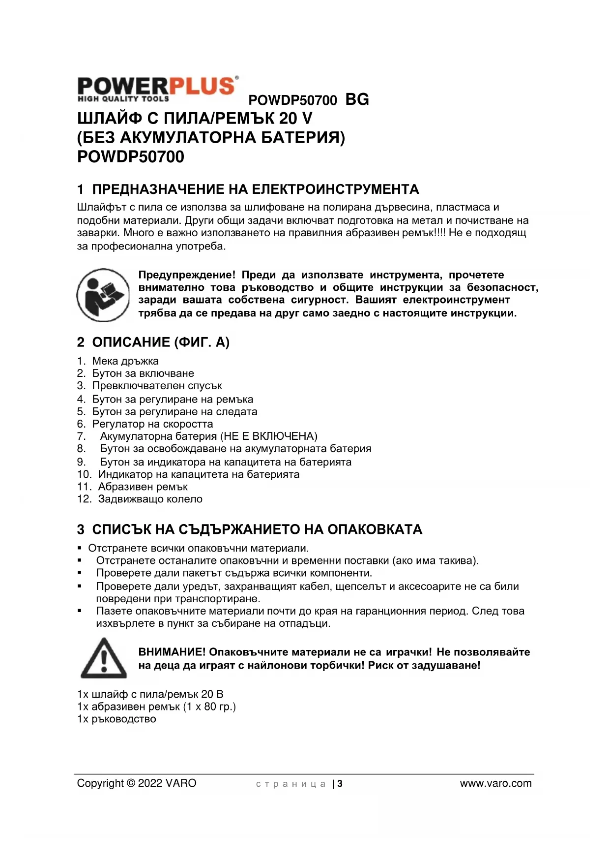 - Пазете опаковъчните материали почти до края на гаранционния период. След това изхвърлете в пункт за събиране на отпадъци. ВНИМАНИЕ! Опаковъчните материали не са играчки! Не позволявайте на деца да играят с найлонови торбички! Риск от задушаване! 1x шлайф с пила/ремък 20 В 1x абразивен ремък (1 x 80 гр.) 1x ръководствоPOWDP50700 BG Copyright © 2022 VARO с т р а н и ц а | 4 www.varo.com