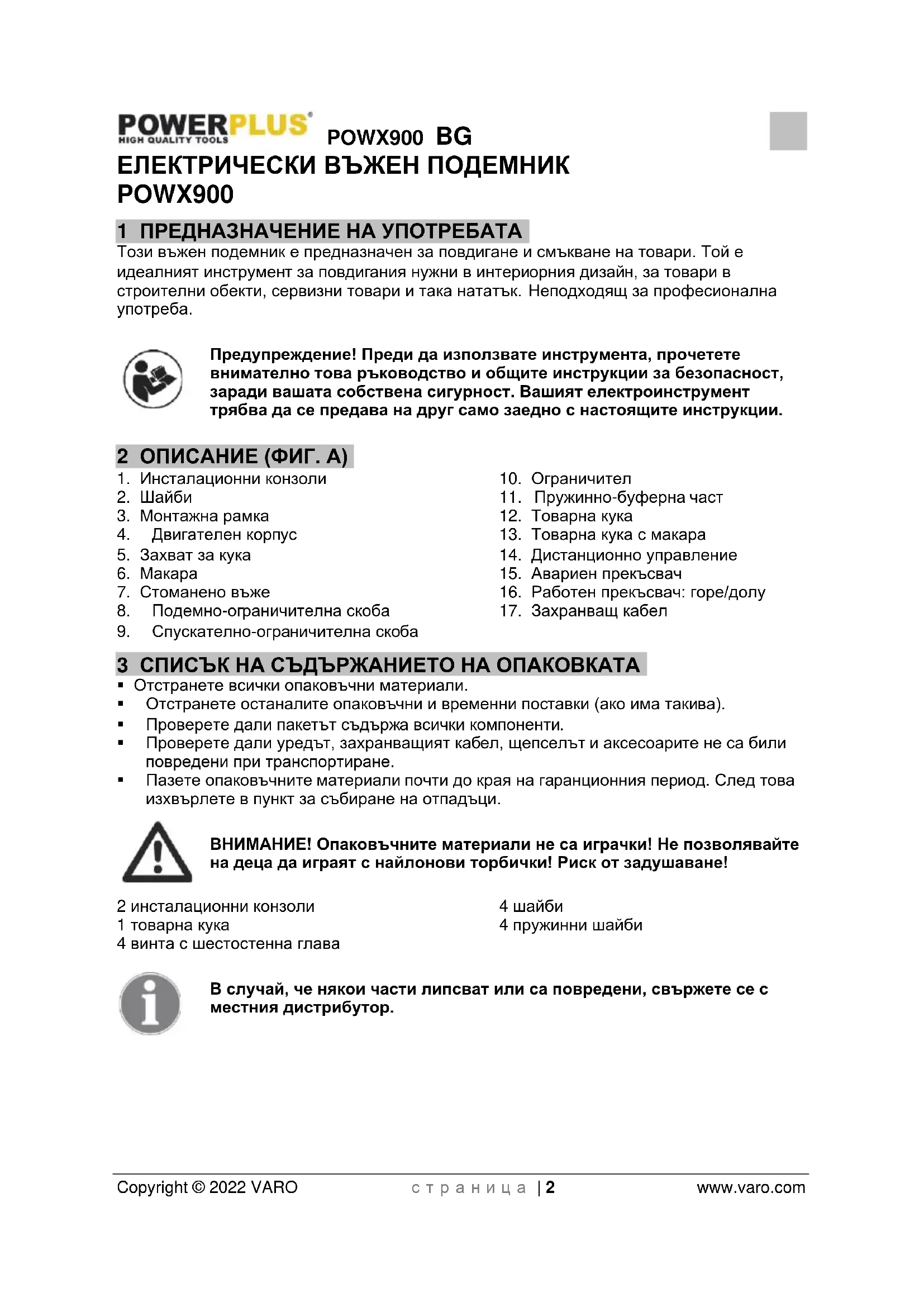 - Когато не е в употреба и преди започване на каквато и да била поддръжка, изключвайте въжения подемник от електрическата мрежа.POWX900 BG Copyright © 2022 VARO с т р а н и ц а | 6 www.varo.com