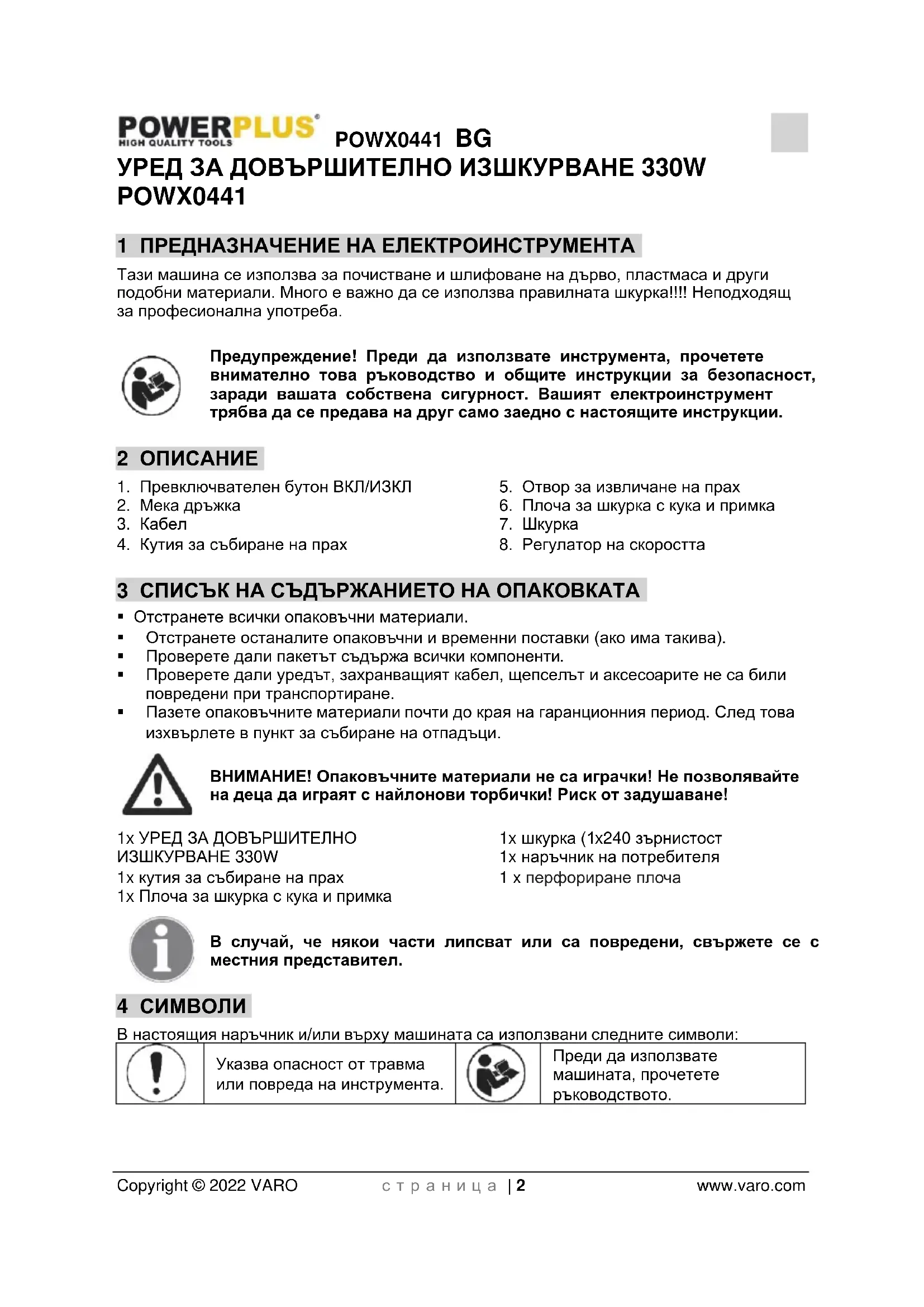 - 15 ДЕКЛАРАЦИЯ ЗА СЪОТВЕТСТВИЕ POWX0441 BG Copyright © 2022 VARO с т р а н и ц а | 2 www.varo.com УРЕД ЗА ДОВЪРШИТЕЛНО ИЗШКУРВАНЕ 330W POWX0441 1 ПРЕДНАЗНАЧЕНИЕ НА ЕЛЕКТРОИНСТРУМЕНТА Тази машина се използва за почистване и шлифоване на дърво, пластмаса и други подобни материали. Много е важно да се използва правилната шкурка!!!! Неподходящ за професионална употреба. Предупреждение! Преди да използвате инструмента, прочетете внимателно това ръководство и общите инструкции за безопасност, заради вашата собствена сигурност. Вашият електроинструмент трябва да се предава на друг само заедно с настоящите инструкции. 2 ОПИСАНИЕ p. 9