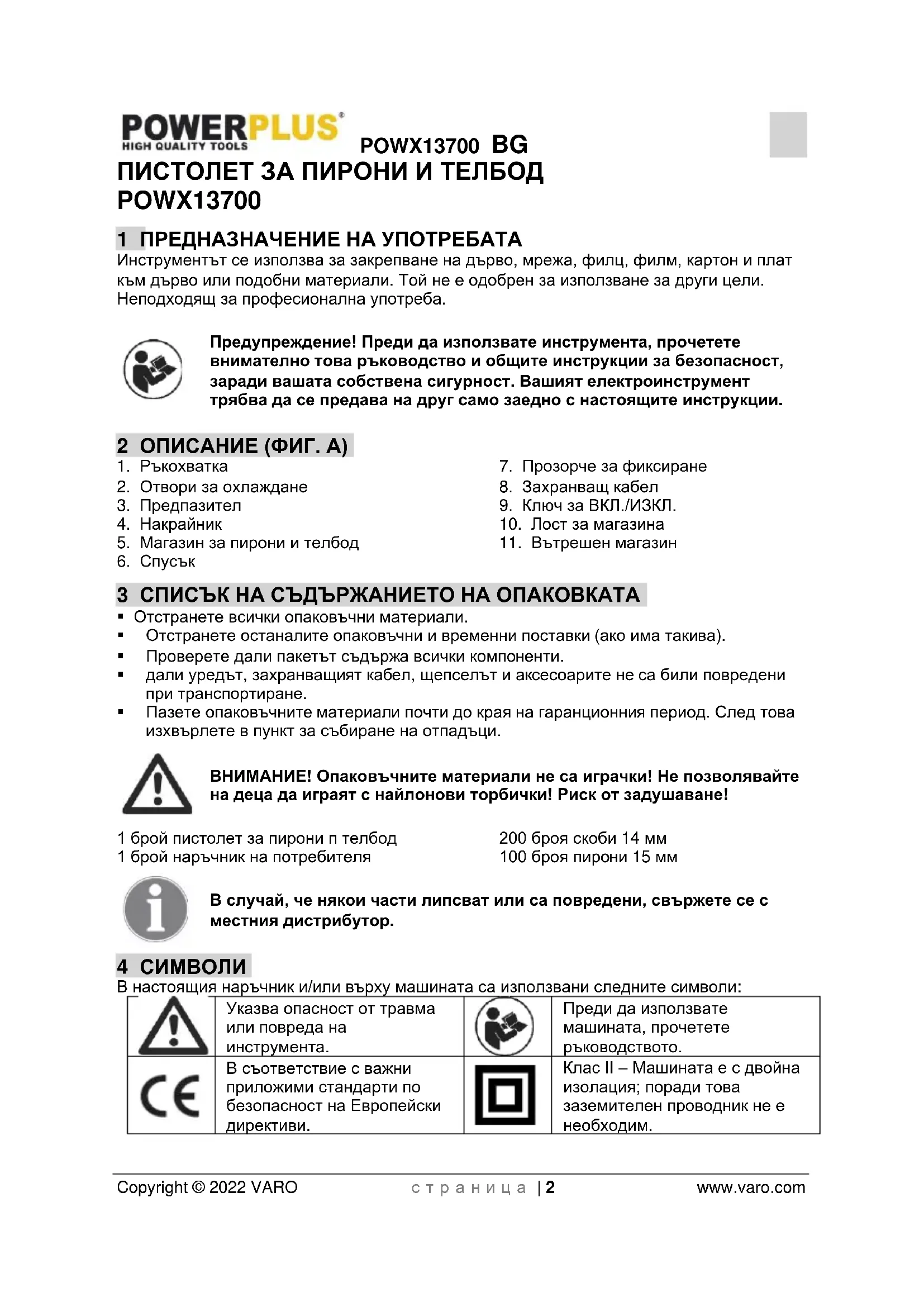 - 14 ДЕКЛАРАЦИЯ ЗА СЪОТВЕТСТВИЕ POWX13700 BG Copyright © 2022 VARO с т р а н и ц а | 2 www.varo.com ПИСТОЛЕТ ЗА ПИРОНИ И ТЕЛБОД POWX13700 1 ПРЕДНАЗНАЧЕНИЕ НА УПОТРЕБАТА Инструментът се използва за закрепване на дърво, мрежа, филц, филм, картон и плат към дърво или подобни материали. Той не е одобрен за използване за други цели. Неподходящ за професионална употреба. Предупреждение! Преди да използвате инструмента, прочетете внимателно това ръководство и общите инструкции за безопасност, заради вашата собствена сигурност. Вашият електроинструмент трябва да се предава на друг само заедно с настоящите инструкции. 2 ОПИСАНИЕ (ФИГ. A) p. 8
