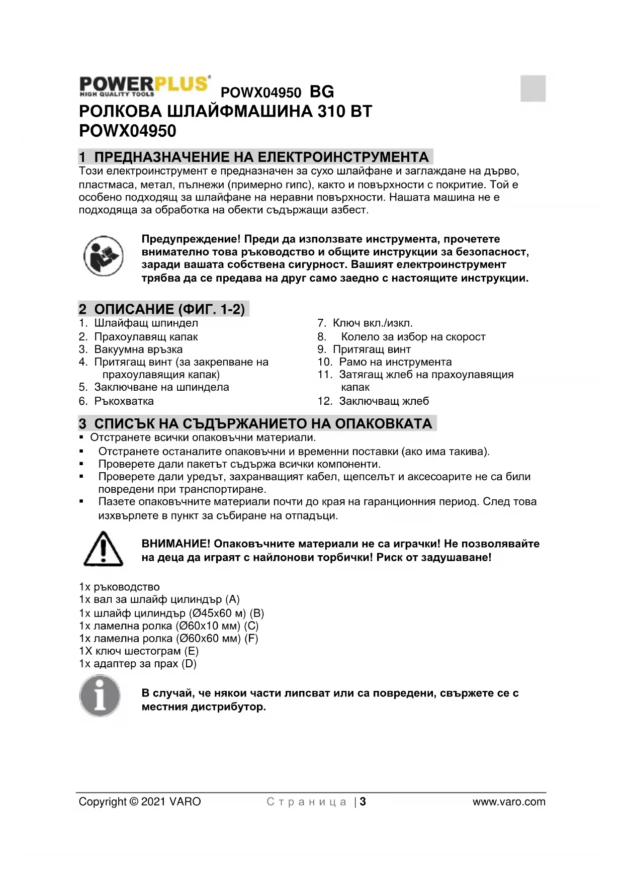 - POWX04950 BG Copyright © 2021 VARO С т р а н и ц а | 2 www.varo.com 14 ДЕКЛАРАЦИЯ ЗА СЪОТВЕТСТВИЕ POWX04950 BG Copyright © 2021 VARO С т р а н и ц а | 3 www.varo.com РОЛКОВА ШЛАЙФМАШИНА 310 ВТ POWX04950 1 ПРЕДНАЗНАЧЕНИЕ НА ЕЛЕКТРОИНСТРУМЕНТА Този електроинструмент е предназначен за сухо шлайфане и заглаждане на дърво, пластмаса, метал, пълнежи (примерно гипс), както и повърхности с покритие. Той е особено подходящ за шлайфане на неравни повърхности. Нашата машина не е подходяща за обработка на обекти съдържащи азбест. Предупреждение! Преди да използвате инструмента, прочетете внимателно това ръководство и общите инструкции за безопасност, заради вашата собствена сигурност. Вашият електроинструмент трябва да се предава на друг само заедно с настоящите инструкции. 2 ОПИСАНИЕ (ФИГ. 1-2) p. 12