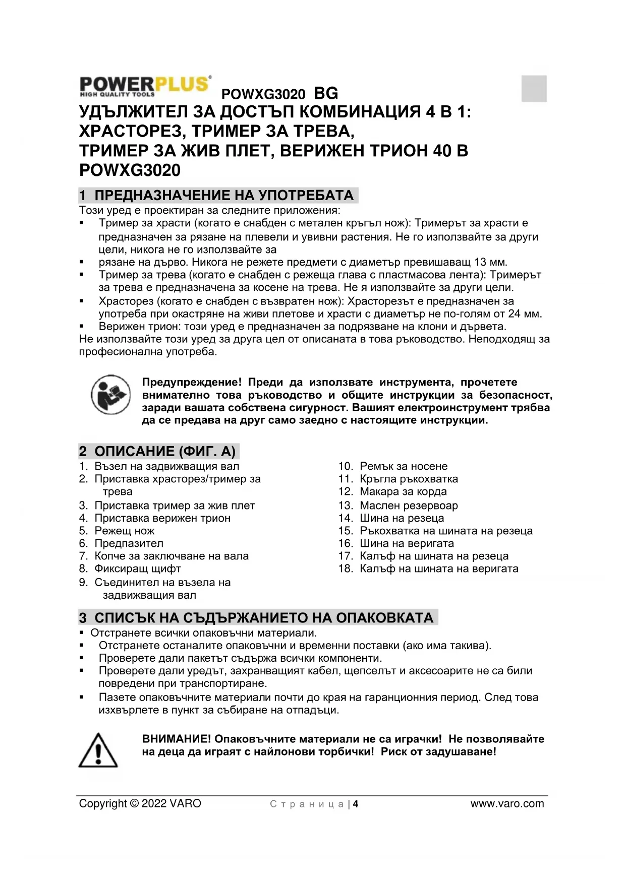 - Пазете опаковъчните материали почти до края на гаранционния период. След това изхвърлете в пункт за събиране на отпадъци. ВНИМАНИЕ! Опаковъчните материали не са играчки! Не позволявайте на деца да играят с найлонови торбички! Риск от задушаване!POWXG3020 BG Copyright © 2022 VARO С т р а н и ц а | 5 www.varo.com 1x възел на задвижващия вал 1x приставка храсторез/тример за