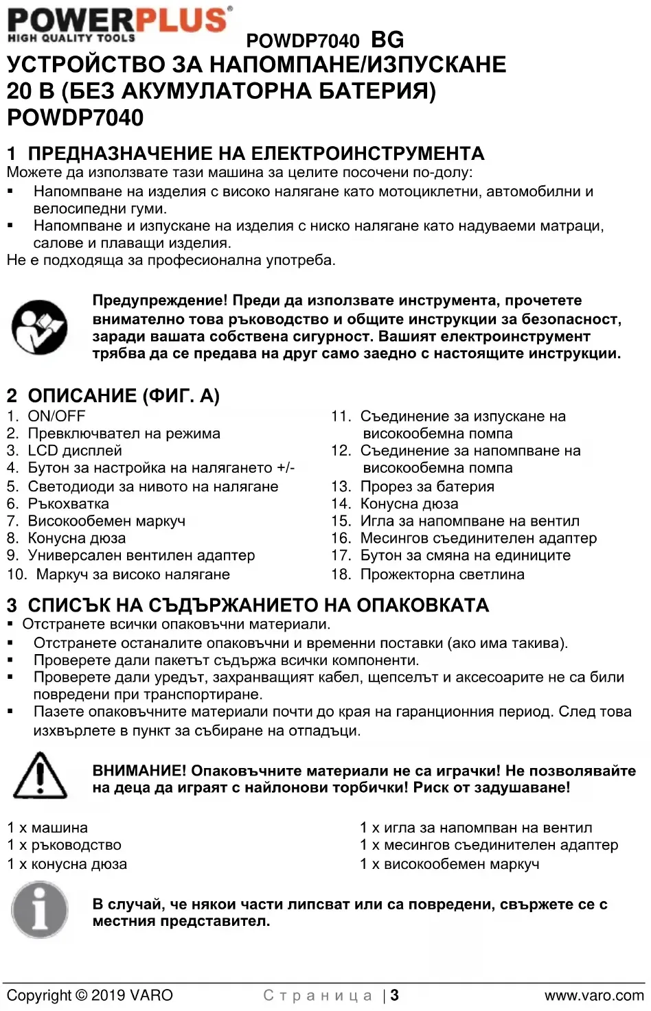 - Много надуваеми изделия имат вътрешна клапа, която предотвратява загуба на въздух по време на напомпване, по-специално въздушните матраци. Освен ако тази клапа не е изместена от дюзата, това надуваемо изделие няма да се напомпа. Набутайте дюзата плътно във вентила, за да се уверите, че тази клапа е отместена.POWDP7040 BG Copyright © 2019 VARO С т р а н и ц а | 9 www.varo.com