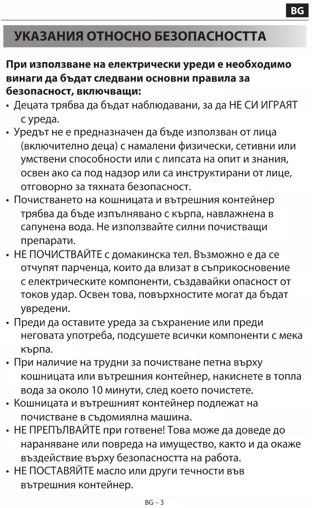- НЕ ПОСТАВЯЙТЕ масло или други течности във вътрешния контейнер.BG – 4 BG – 4