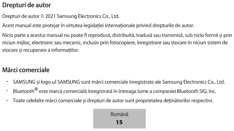14Авторски права Copyright © 2021 Samsung Electronics Co., Ltd. Това ръководство е защитено от международни закони за авторски права. Никоя част от ръководството не може да бъде възпроизвеждана, разпространявана, превеждана или прехвърляна под каквато и да е форма или по какъвто и да е начин, електронен или механичен, в това число фотокопиране, запис или съхранение в каквато и да е система за информационно съхранение и