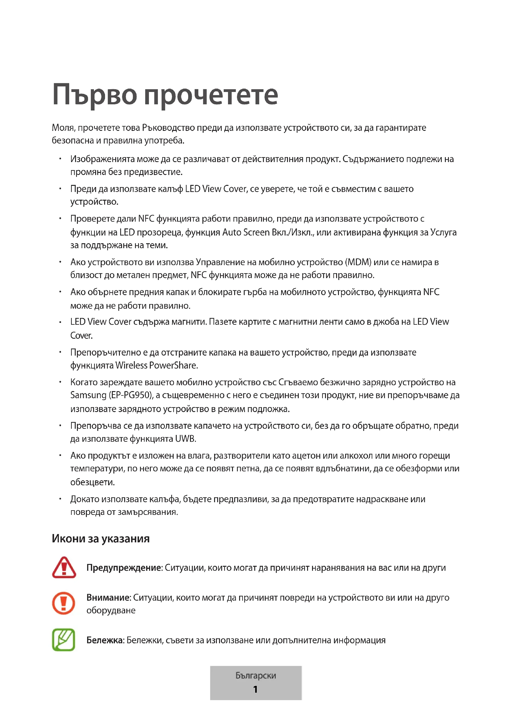 Докато използвате калъфа, бъдете предпазливи, за да предотвратите надраскване или повреда от замърсявания. Икони за указания Предупреждение: Ситуации, които могат да причинят наранявания на вас или на други Внимание: Ситуации, които могат да причинят повреди на устройството ви или на друго