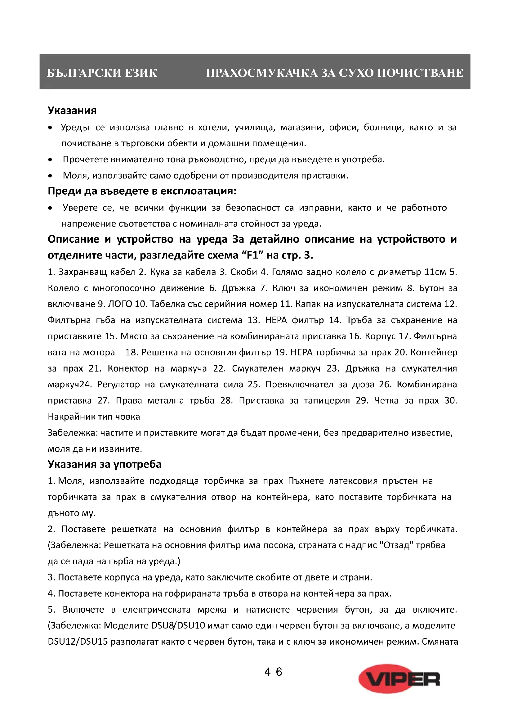 Уредът се използва главно в хотели, училища, магазини, офиси, болници, както и за почистване в търговски обекти и домашни помещения. Прочетете внимателно това ръководство, преди да въведете в употреба. Моля, използвайте само одобрени от производителя приставки. Преди да въведете в експлоатация: Уверете се, че всички функции за безопасност са изправни, както и че работното напрежение съответства с номиналната стойност за уреда. Описание и устройство на уреда За детайлно описание на устройството и отделните части, разгледайте схема “F1” на стр. 3.
