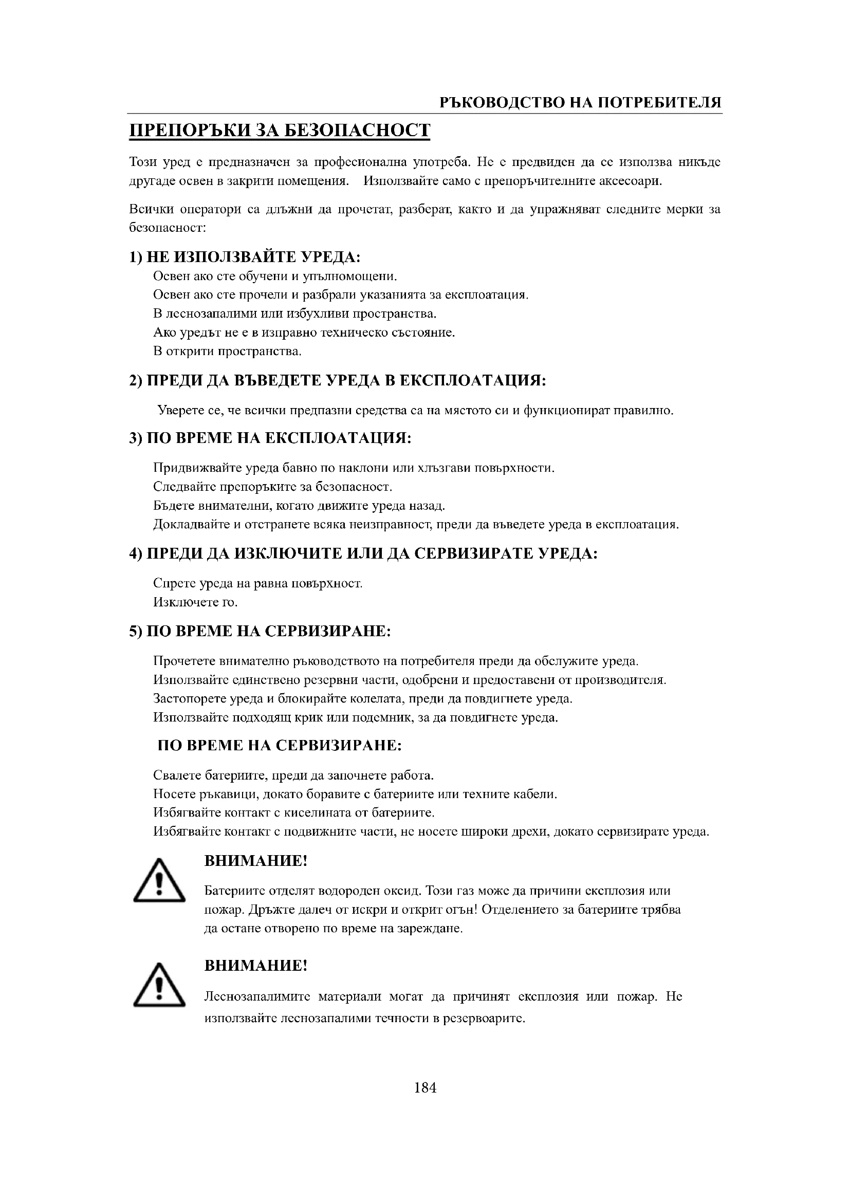 Леснозапалимите материали могат да причинят експлозия или пожар. Не използвайте леснозапалими течности в резервоарите.РЪКОВОДСТВО НА ПОТРЕБИТЕЛЯ