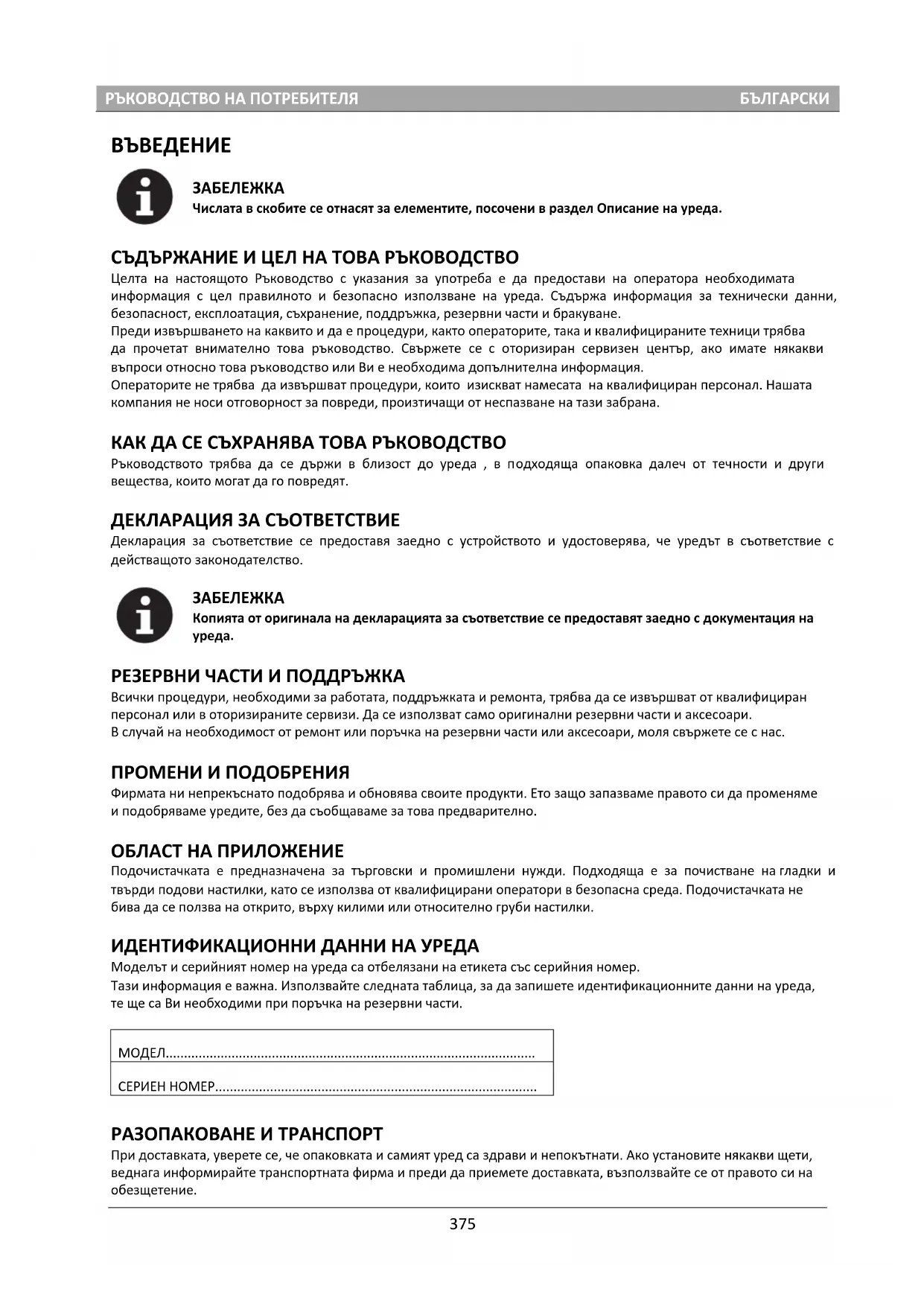 РЕЗЕРВНИ ЧАСТИ И ПОДДРЪЖКА Всички процедури, необходими за работата, поддръжката и ремонта, трябва да се извършват от квалифициран персонал или в оторизираните сервизи. Да се използват само оригинални резервни части и аксесоари. В случай на необходимост от ремонт или поръчка на резервни части или аксесоари, моля свържете се с нас. ПРОМЕНИ И ПОДОБРЕНИЯ Фирмата ни непрекъснато подобрява и обновява своите продукти. Ето защо запазваме правото си да променяме и подобряваме уредите, без да съобщаваме за това предварително. ОБЛАСТ НА ПРИЛОЖЕНИЕ Подочистачката е предназначена за търговски и промишлени нужди. Подходяща е за почистване на гладки и твърди подови настилки, като се използва от квалифицирани оператори в безопасна среда. Подочистачката не бива да се ползва на открито, върху килими или относително груби настилки. ИДЕНТИФИКАЦИОННИ ДАННИ НА УРЕДА Моделът и серийният номер на уреда са отбелязани на етикета със серийния номер. Тази информация е важна. Използвайте следната таблица, за да запишете идентификационните данни на уреда, те ще са Ви необходими при поръчка на резервни части. МОДЕЛ..................................................................................................... СЕРИЕН НОМЕР........................................................................................ РАЗОПАКОВАНЕ И ТРАНСПОРТ При доставката, уверете се, че опаковката и самият уред са здрави и непокътнати. Ако установите някакви щети, веднага информирайте транспортната фирма и преди да приемете доставката, възползвайте се от правото си на обезщетение. 375РЪКОВОДСТВО НА ПОТРЕБИТЕЛЯ