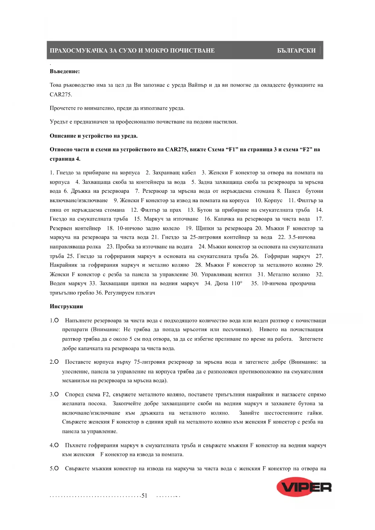 Това ръководство има за цел да Ви запознае с уреда Вайпър и да ви помогне да овладеете функциите на CAR275. Прочетете го внимателно, преди да използвате уреда. Уредът е предназначен за професионално почистване на подови настилки. Описание и устройство на уреда. Относно части и схеми на устройството на CAR275, вижте Схема “F1” на страница 3 и схема “F2” на страница 4.