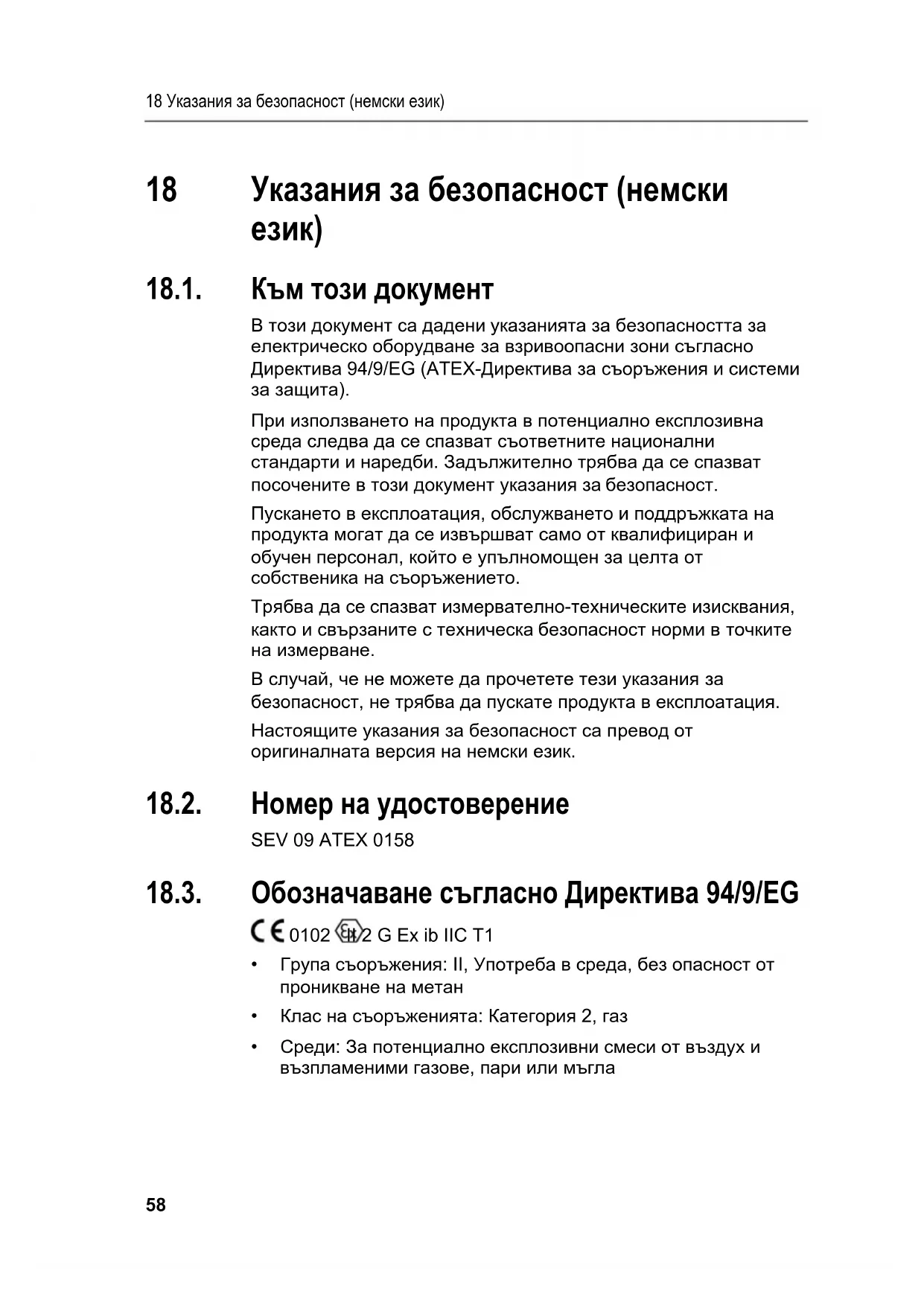 18.1. Към този документ В този документ са дадени указанията за безопасността за електрическо оборудване за взривоопасни зони съгласно Директива 94/9/EG (ATEX-Директива за съоръжения и системи за защита). При използването на продукта в потенциално експлозивна среда следва да се спазват съответните национални стандарти и наредби. Задължително трябва да се спазват посочените в този документ указания за безопасност. Пускането в експлоатация, обслужването и поддръжката на продукта могат да се извършват само от квалифициран и обучен персонал, който е упълномощен за целта от собственика на съоръжението. Трябва да се спазват измервателно-техническите изисквания, както и свързаните с техническа безопасност норми в точките на измерване. В случай, че не можете да прочетете тези указания за безопасност, не трябва да пускате продукта в експлоатация. Настоящите указания за безопасност са превод от оригиналната версия на немски език. 18.2. Номер на удостоверение SEV 09 ATEX 0158 18.3. Обозначаване съгласно Директива 94/9/EG 0102 II 2 G Ex ib IIC T1