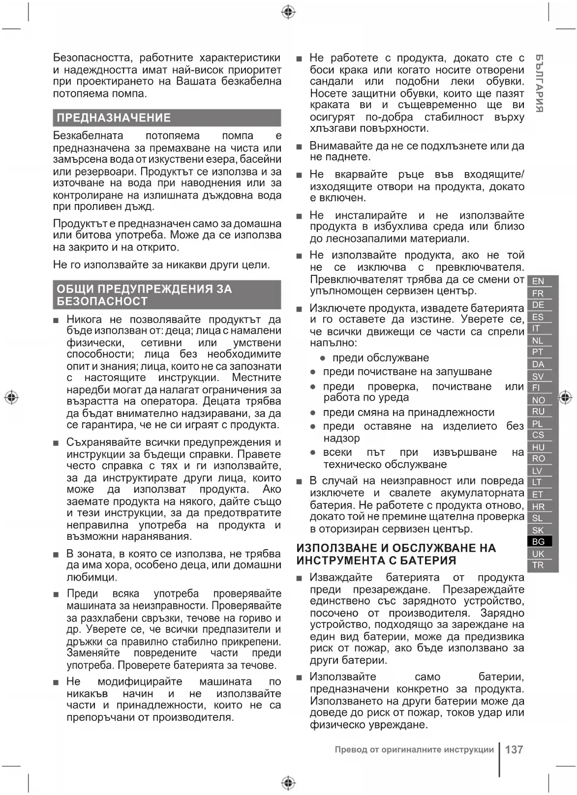 Безопасността, работните характеристики и надеждността имат най-висок приоритет при проектирането на Вашата безкабелна потопяема помпа. ПРЕДНАЗНАЧЕНИЕ Безкабелната потопяема помпа е предназначена за премахване на чиста или замърсена вода от изкуствени езера, басейни или резервоари. Продуктът се използва и за източване на вода при наводнения или за контролиране на излишната дъждовна вода при проливен дъжд. Продуктът е предназначен само за домашна или битова употреба. Може да се използва на закрито и на открито. Не го използвайте за никакви други цели. ОБЩИ ПРЕДУПРЕЖДЕНИЯ ЗА БЕЗОПАСНОСТ ■ Никога не позволявайте продуктът да бъде използван от: деца; лица с намалени физически, сетивни или умствени способности; лица без необходимите опит и знания; лица, които не са запознати с настоящите инструкции. Местните наредби могат да налагат ограничения за възрастта на оператора. Децата трябва да бъдат внимателно надзиравани, за да се гарантира , че не си играят с продукта. ■ Съхранявайте всички предупреждения и инструкции за бъдещи справки. Правете често справка с тях и ги използвайте, за да инструктирате други лица, които може да използват продукта. Ако заемате продукта на някого, дайте също и тези инструкции, за да предотвратите неправилна употреба на продукта и възможни наранявания. ■ В зоната, в която се използва, не трябва да има хора, особено деца, или домашни