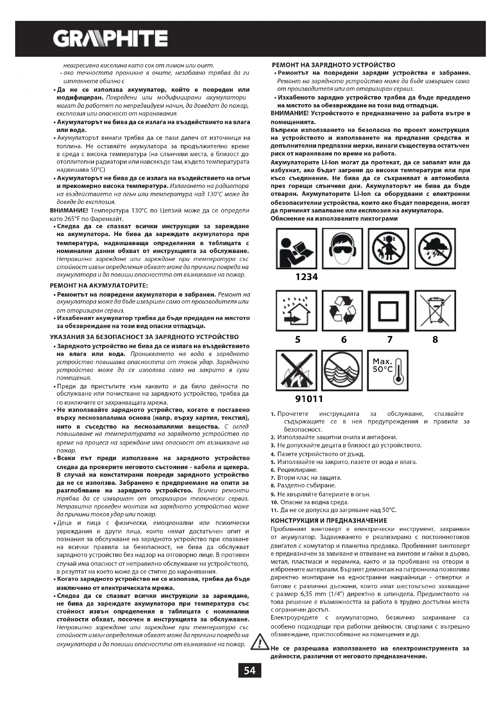 съдържащите се в нея предупреждения и правила за безопасност. 2. Използвайте защитни очила и антифони.3. Не допускайте децата в близост до устройството. 4. Пазете устройството от дъжд.5. Използвайте на закрито, пазете от вода и влага.6. Рециклиране.7. Втори клас на защита.8. Разделно събиране.9. Не хвърляйте батериите в огън.10. Опасни за водна среда.11. Да не се допуска до загряване над 50°C. КОНСТРУКЦИЯ И ПРЕДНАЗНАЧЕНИЕ Пробивният винтоверт е електрически инструмент, захранван от акумулатор. Задвижването е реализирано с постояннотоков двигател с комутатор и планетна предавка. Пробивният винтоверт е предназначен за завиване и отвиване на винтове и гайки в дърво, метал, пластмаси и керамика, както и за пробиване на отвори в изброените материали. Бързият демонтаж на патронника позволява директно монтиране на едностранни накрайници - отвертки и битове с различни дължини, които имат шестоъгълно захващане с размер 6,35 mm (1/4”) директно в шпиндела. Предимството на това решение е възможността за работа в трудно достъпни места с ограничен достъп. Електроуредите с акумулаторно, безжично захранване са особено подходящи при работни дейности, свързани с вътрешно обзавеждане, приспособяване на помещения и др. Не се разрешава използването на електроинструмента за дейности, различни от неговото предназначение.55 ОПИСАНИЕ НА ГРАФИЧНИТЕ СТРАНИЦИ Представеното по-долу номериране се отнася за елементите на устройството, представени на графичните страници на настоящата инструкция.