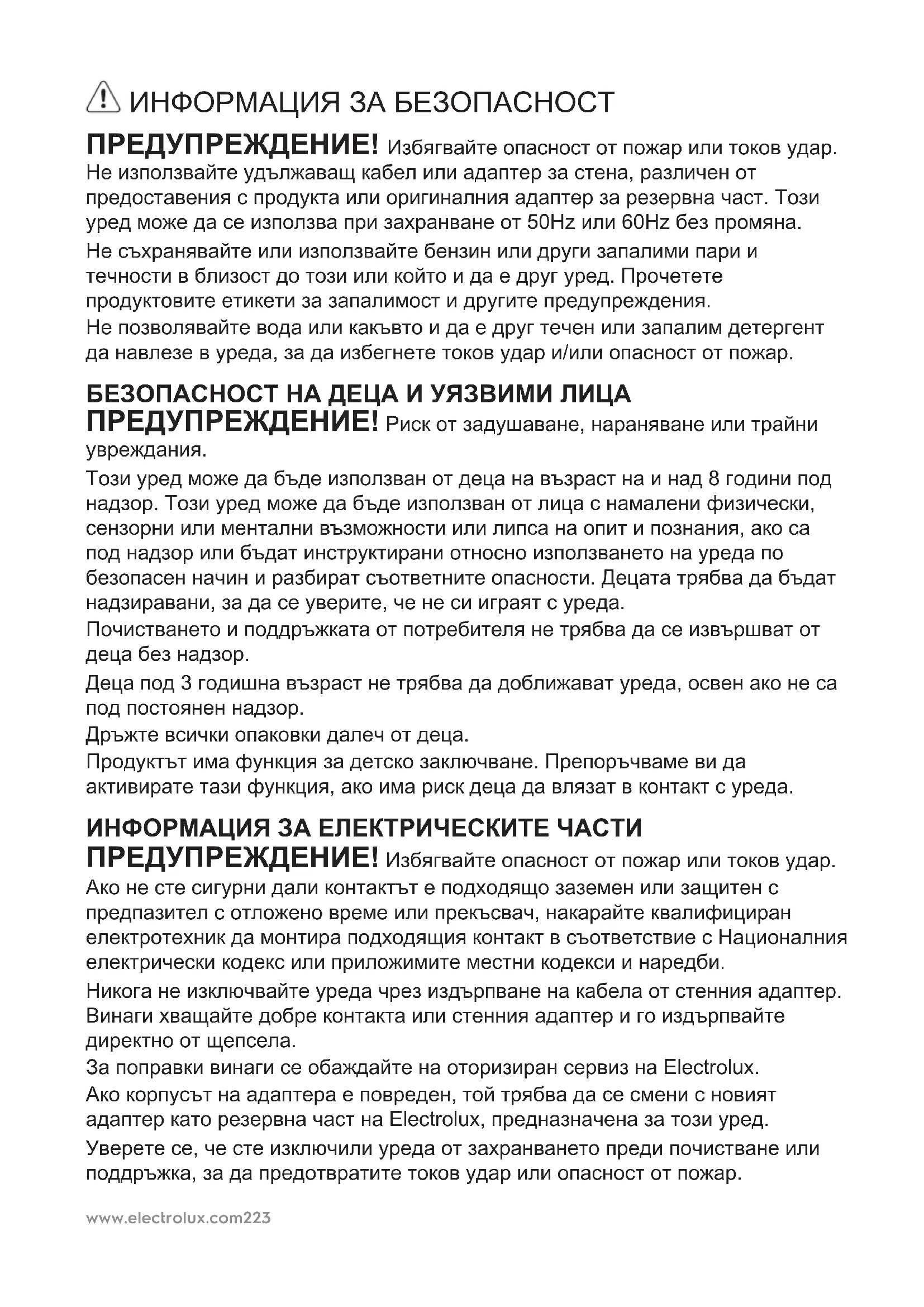 üks probleem, mida pole selles loetelus, VÕI ükski eespool toodud sammudest ei ole aidanud lahendada seda probleemi. Rohkem rikke otsimise ja kõrvaldamise juhiseid ja FAQ (korduma kippuvate küsimuste (KKK)) vastuseid leiate meie veebisaidilt VÕI Electroluxi äpist toote informatsiooni lehtedelt või abi saamiseks võtke otse ühendust Electroluxi volitatud teeninduskeskusega. Täname! Kui võtate ühendust Electroluxi teenindusega, siis palume hoida käepärast seadme PNC ja seerianumber. Selle teabe leiate andmesildilt, mis asub seadme alumise osa peal.www.electrolux.com 223 ИНФОРМАЦИЯ ЗА БЕЗОПАСНОСТ ПРЕДУПРЕЖДЕНИЕ! Избягвайте опасност от пожар или токов удар. Не използвайте удължаващ кабел или адаптер за стена, различен от предоставения с продукта или оригиналния адаптер за резервна част. Този уред може да се използва при захранване от 50Hz или 60Hz без промяна. Не съхранявайте или използвайте бензин или други запалими пари и течности в близост до този или който и да е друг уред. Прочетете продуктовите етикети за запалимост и другите предупреждения. Не позволявайте вода или какъвто и да е друг течен или запалим детергент да навлезе в уреда, за да избегнете токов удар и/или опасност от пожар. БЕЗОПАСНОСТ НА ДЕЦА И УЯЗВИМИ ЛИЦА ПРЕДУПРЕЖДЕНИЕ! Риск от задушаване, нараняване или трайни увреждания. Този уред може да бъде използван от деца на възраст на и над 8 години под надзор. Този уред може да бъде използван от лица с намалени физически, сензорни или ментални възможности или липса на опит и познания, ако са под надзор или бъдат инструктирани относно използването на уреда по безопасен начин и разбират съответните опасности. Децата трябва да бъдат надзиравани, за да се уверите, че не си играят с уреда. Почистването и поддръжката от потребителя не трябва да се извършват от деца без надзор. Деца под 3 годишна възраст не трябва да доближават уреда, освен ако не са под постоянен надзор. Дръжте всички опаковки далеч от деца. Продуктът има функция за детско заключване. Препоръчваме ви да активирате тази функция, ако има риск деца да влязат в контакт с уреда. ИНФОРМАЦИЯ ЗА ЕЛЕКТРИЧЕСКИТЕ ЧАСТИ ПРЕДУПРЕЖДЕНИЕ! Избягвайте опасност от пожар или токов удар. Ако не сте сигурни дали контактът е подходящо заземен или защитен с предпазител с отложено време или прекъсвач, накарайте квалифициран електротехник да монтира подходящия контакт в съответствие с Националния електрически кодекс или приложимите местни кодекси и наредби. Никога не изключвайте уреда чрез издърпване на кабела от стенния адаптер. Винаги хващайте добре контакта или стенния адаптер и го издърпвайте директно от щепсела. За поправки винаги се обаждайте на оторизиран сервиз на Electrolux. Ако корпусът на адаптера е повреден, той трябва да се смени с новият адаптер като резервна част на Electrolux, предназначена за този уред. Уверете се, че сте изключили уреда от захранването преди почистване или поддръжка, за да предотвратите токов удар или опасност от пожар.www.electrolux.com224 МЕРКИ ЗА БЕЗОПАСНОСТ ВНИМАНИЕ! Избягвайте сериозни наранявания или смърт. Не вкарвайте или поставяйте пръстите си или обекти в решетката за извеждане на въздуха на уреда. В случай на повреда (искри, миризма на изгоряло и др.), незабавно спрете работа с уреда, изключете захранващият кабел и се обадете в оторизиран сервиз на Electrolux. Не работете с уреда когато сте с мокри ръце. ВНИМАНИЕ! Избягвайте наранявания или повреди по уреда или собственост. Не насочвайте въздушният поток към камини или други източници на топлина, тъй като това може да доведе то запалвания. Не се катерете или постав
