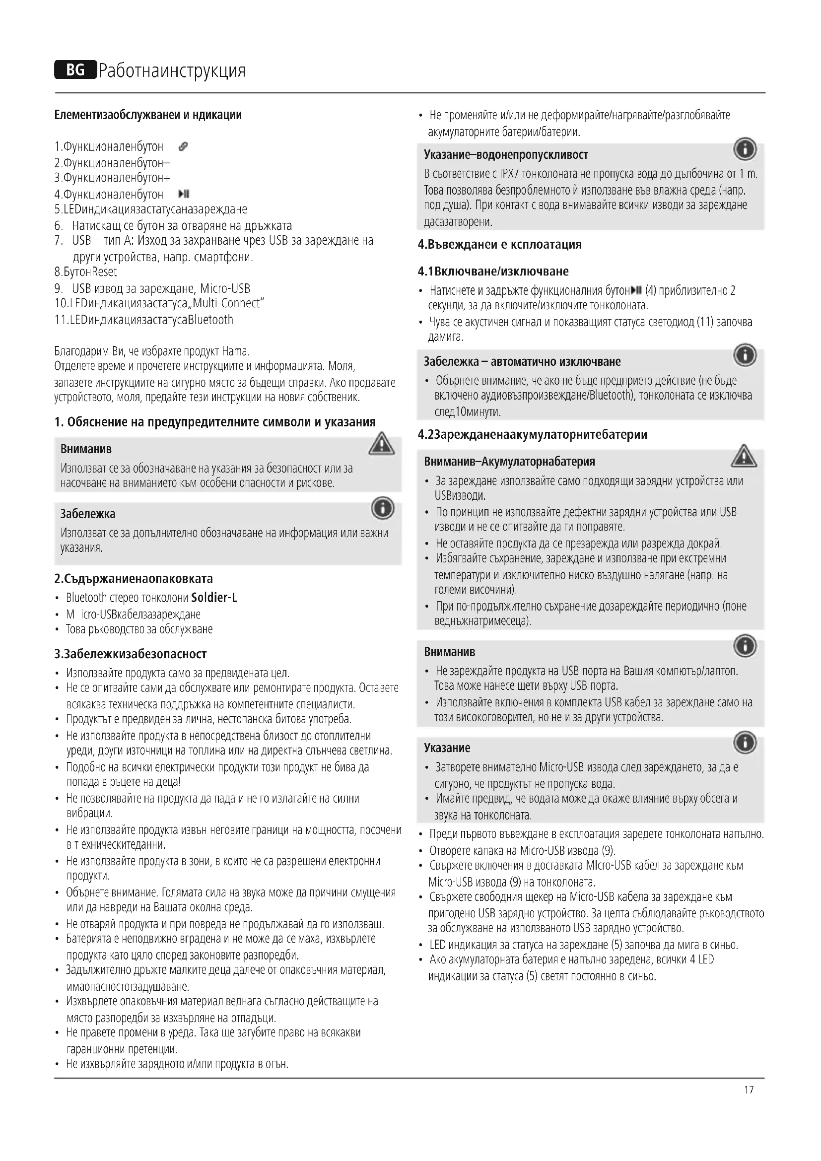 - Не променяйте и/илинедеформирайте/нагрявайте/разглобявайте акумулаторните батерии/батерии. Указание – водонепропуск ливост Всъответствие с IPX7 тонколоната не пропускаводадодълбочина от 1m. Това позволявабезпроблемното ѝизползваневъв влажнасреда (напр. поддуша). При контакт сводавнимавайте всички изводи за зареждане да са затворени.