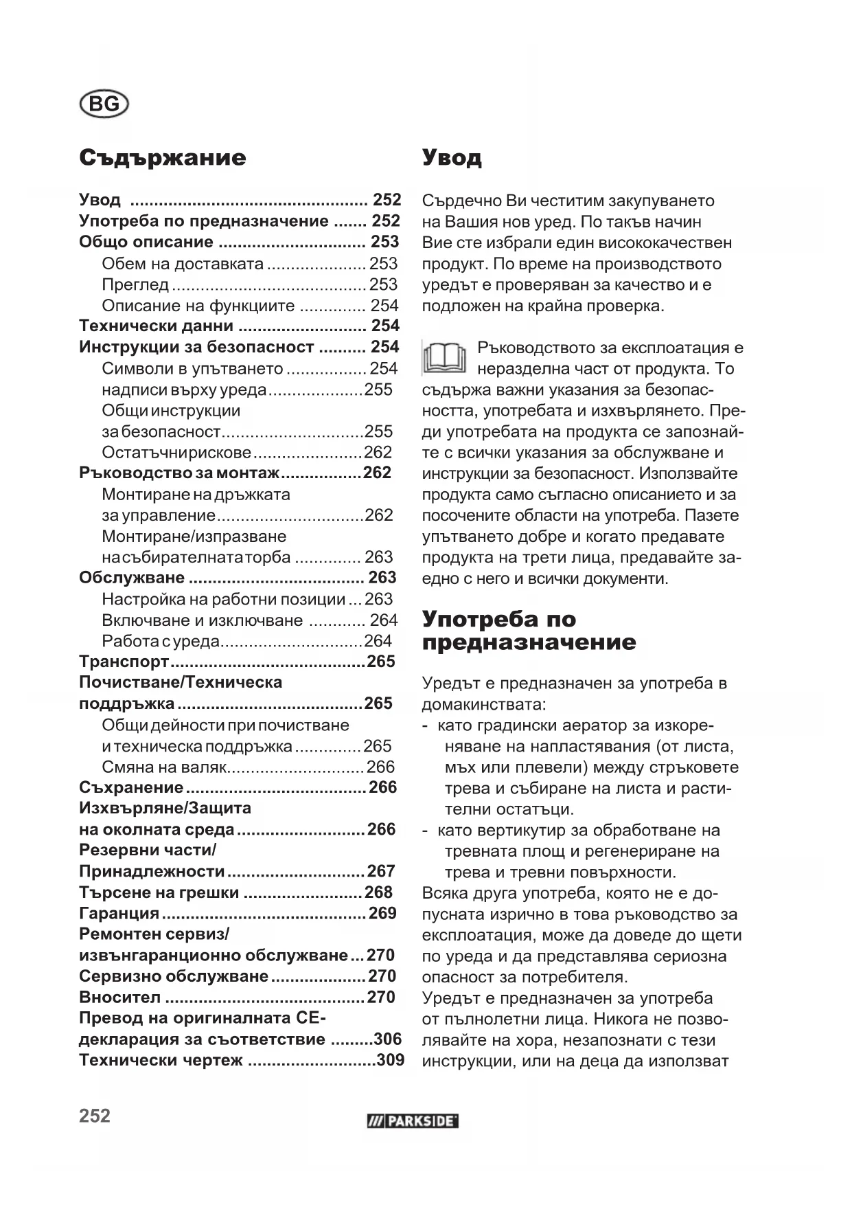 Сърдечно Ви честитим закупуването на Вашия нов уред. По такъв начин Вие сте избрали един висококачествен продукт. По време на производството уредът е проверяван за качество и е подложен на крайна проверка. Ръководството за експлоатация е неразделна част от продукта. То съдържа важни указания за безопас- ността, употребата и изхвърлянето. Пре- ди употребата на продукта се запознай- те с всички указания за обслужване и инструкции за безопасност. Използвайте продукта само съгласно описанието и за посочените области на употреба. Пазете упътването добре и когато предавате продукта на трети лица, предавайте за- едно с него и всички документи. Употреба по предназначение Уредът е предназначен за употреба в домакинствата: - като градински аератор за изкоре- няване на напластявания (от листа, мъх или плевели) между стръковете трева и събиране на листа и расти- телни остатъци. - като вертикутир за обработване на тревната площ и регенериране на трева и тревни повърхности. Всяка друга употреба, която не е до- пусната изрично в това ръководство за експлоатация, може да доведе до щети по уреда и да представлява сериозна опасност за потребителя. Уредът е предназначен за употреба от пълнолетни лица. Никога не позво- лявайте на хора, незапознати с тези инструкции, или на деца да използват Превод на оригиналната CE- декларация за съответствие .........306 Технически чертеж ...........................309253