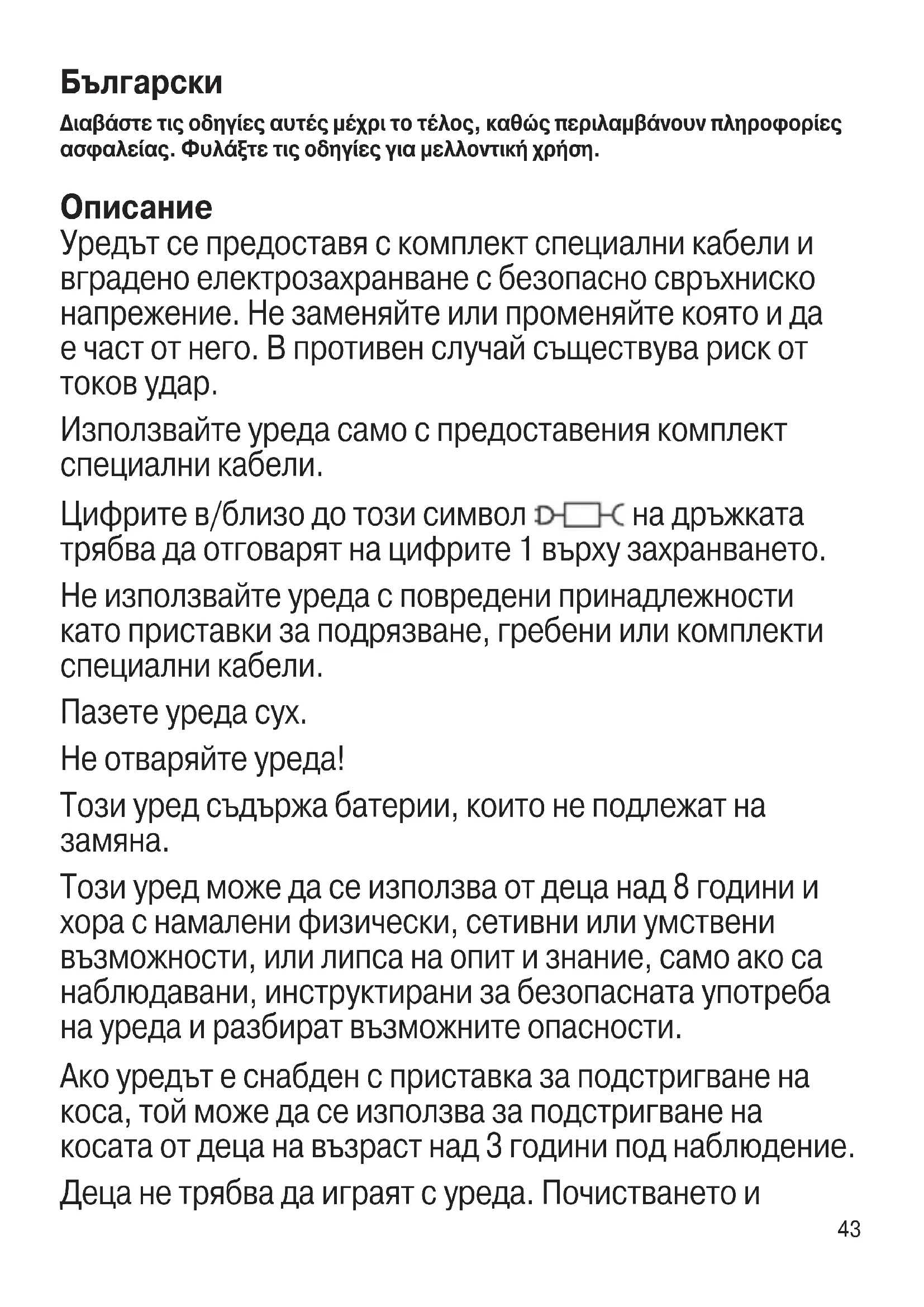 Уредът се предоставя с комплект специални кабели и вградено електрозахранване с безопасно свръхниско напрежение. Не заменяйте или променяйте която и да е част от него. В противен случай съществува риск от токов удар. Използвайте уреда само с предоставения комплект специални кабели. Цифрите в/близо до този символ на дръжката трябва да отговарят на цифрите 1 върху захранването. Не използвайте уреда с повредени принадлежности като приставки за подрязване, гребени или комплекти специални кабели. Пазете уреда сух. Не отваряйте уреда! Този уред съдържа батерии, които не подлежат на