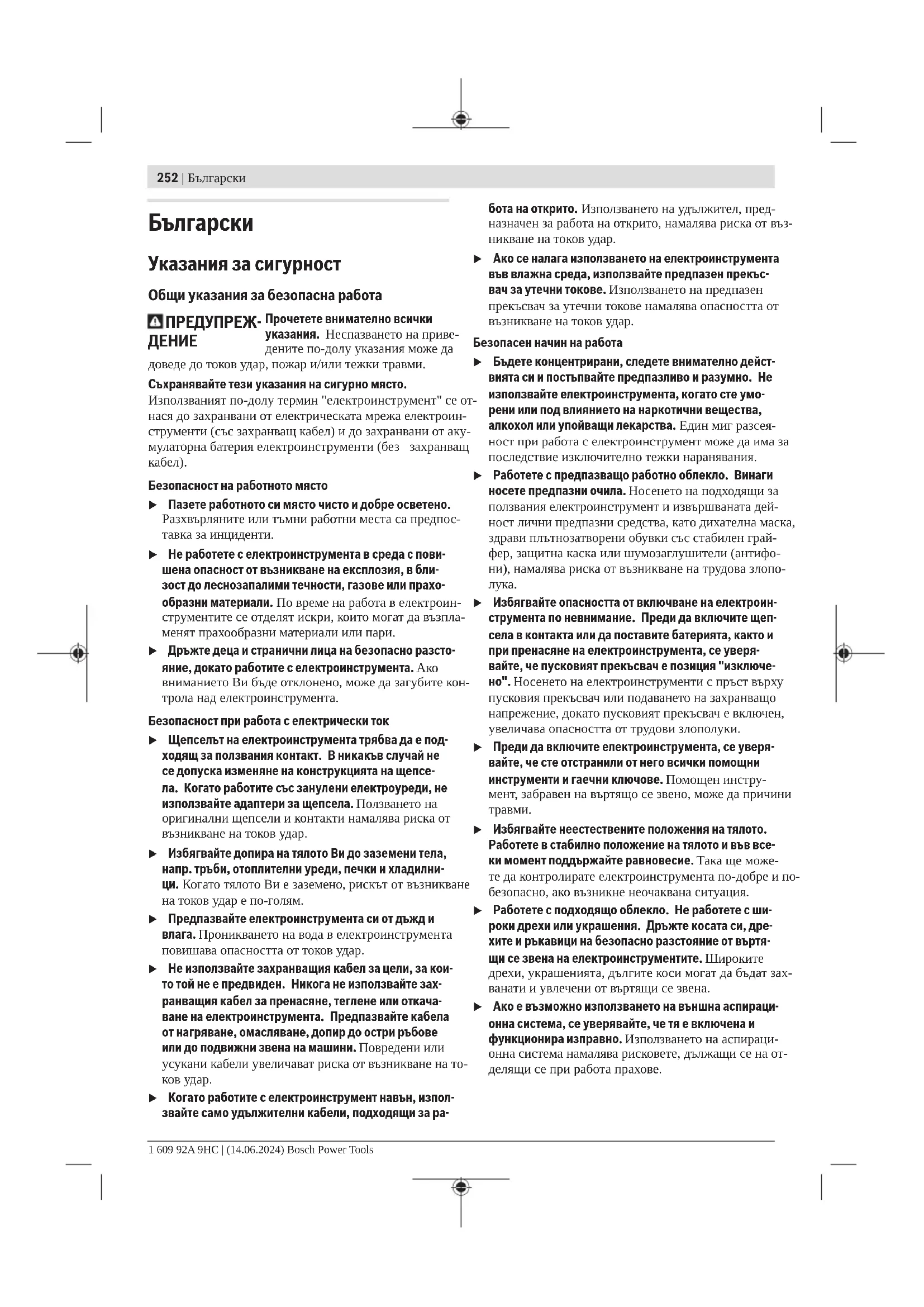 u Избягвайте неестествените положения на тялото. Работете в стабилно положение на тялото и във все- ки момент поддържайте равновесие. Така ще може- те да контролирате електроинструмента по-добре и по- безопасно, ако възникне неочаквана ситуация. u Работете с подходящо облекло. Не работете с ши- роки дрехи или украшения. Дръжте косата си, дре- хите и ръкавици на безопасно разстояние от въртя- щи се звена на електроинструментите. Широките дрехи, украшенията, дългите коси могат да бъдат зах- ванати и увлечени от въртящи се звена. u Ако е възможно използването на външна аспираци- онна система, се уверявайте, че тя е включена и функционира изправно. Използването на аспираци- онна система намалява рисковете, дължащи се на от- делящи се при работа прахове. 1 609 92A 9HC | (14.06.2024) Bosch Power ToolsБългарски | 253 Грижливо отношение към електроинструментите u Не претоварвайте електроинструмента. Използ- вайте електроинструментите само съобразно тях- ното предназначение. Ще работите по‑добре и по‑безопасно, когато използвате подходящия електро- инструмент в зададения от производителя диапазон на натоварване. u Не използвайте електроинструмент, чиито пусков прекъсвач е повреден. Електроинструмент, който не може да бъде изключван и включван по предвидения от производителя начин, е опасен и трябва да бъде ре-