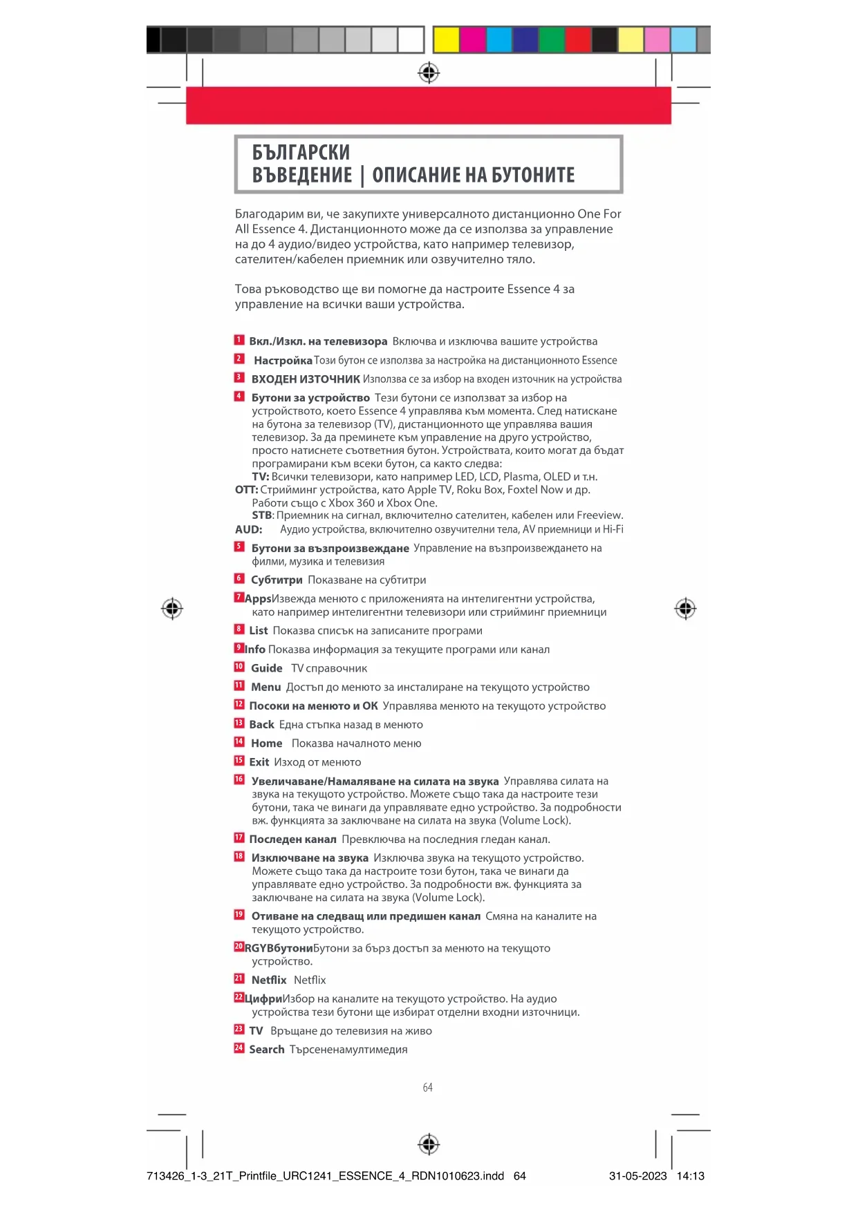 Essence 4 URC 1241 - дистанционно управление ONE FOR ALL - Безплатно ръководство за потребителя